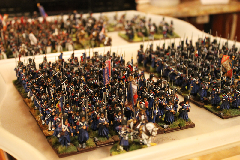 Das ganze Spiel, der Ablauf und in erster Linie die Gespräche vor, während und nach der Schlacht haben mir bestätigt, dass die meisten Regelwerke (so auch Black Powder) nicht in der Lage sind eine Schlacht der napoleonischen Zeit nachzustellen. Es sollte eigentlich immer Pflicht sein eine „unsichtbare“ Reserve von mindestens 1/3 der Armee zurückzubehalten. Das erfüllt gleich zwei Funktionen, zum einen den gewissen „Fog of War“…also die Unwissenheit über die Stärke und Qualität der feindlichen Armee und deren Disposition, sowie zum andren die Möglichkeit, Truppen nach und nach in die Schlacht zu senden. Eine Schlachtreihe der damaligen Zeit ließ sich nämlich nicht beliebig ausdehnen. Die Notwendigkeit der Kommunikation ließ nur eine bestimmte Breite zu. Aus diesem Grund war die Tiefe der Aufstellung in mehrere sogenannte Treffen gegliedert. Im Grunde genommen müsste das Spielfeld bei kleinen Spielen also eher lange Außenkanten und im Verhältnis relativ kurze Grundlinien aufweisen.
