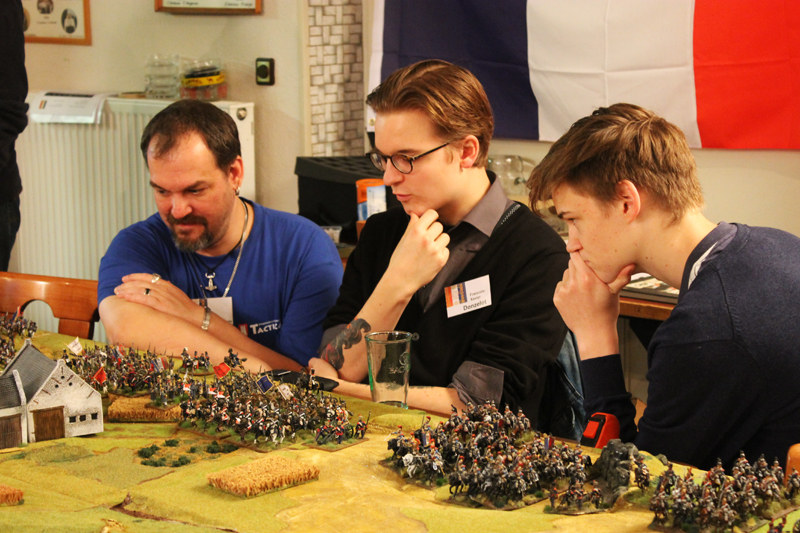 danke für eure Kommentare. Ich bin ja kein Black Powder Regelfachmann, aber ich schätze, dass rund die Hälfte der Regeln bei diesem Spiel über Bord geworfen wurden (Bewegungseinschränkungen, Moral usw.)…und ja, wenn ich am Schluss nicht ständig Steinchen gezählt hätte, wäre das Spiel wesentlich früher vorbei gewesen. Vielleicht war die komplette rechte Flanke mit einem Spieler (Dirk) zu schwach besetzt. Nebenbei hat Dirk ja auch noch für die Franzosen die Regeln erläutert! Da kann man halt nicht alles im Blick haben.