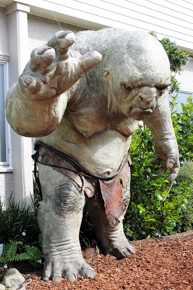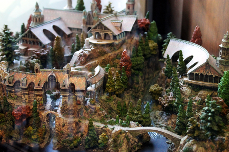 Man kann außerdem an einer Studio-Tour, der „Window into Workshop“ teilnehmen. Ich hatte das Glück, die erste Tour des Tages zu erwischen, welche nur aus mir und einem zweiten Besucher bestand. Auf dieser Tour werden die Arbeitsweisen und Fertigungsprozesse des Weta Workshops erläutert. Man kann sogar einigen Mitarbeiter bei der Arbeit zusehen und der Guide der Tour ist ebenfalls ein Mitarbeiter, der gern alle Fragen beantwortet. Während des Rundganges ist es gestattet viele der Requisiten in die Hand zu nehmen oder sogar anzulegen. So kann man beispielsweise den riesigen Morgenstern des Hexenkönigs schwingen, die künstlichen Oberarme eines Zwerges anlegen oder die Kunststoffrüstung Saurons ertasten. Die erste Station der Tour ist die Fertigung von Waffen. Aus großen Kunststoffblöcken, ein Material mit ähnlichen Eigenschaften von Holz, wird zunächst eine Hälfte der Grundform gefräst. Die beiden dadurch entstandenen Werkstücke werden anschließend zusammengefügt und manuell mit einer Vielzahl von weiteren Details versehen. Dieses Master wird nun abgeformt und die Form mit einem schwarz gefärbten Resin ausgegossen. Anschließend erfolgen die Bemalung und schließlich die Alterung der fertigen Waffe. Während des Rundgangs ist man übrigens von einer unvorstellbaren Masse von Requisiten und Bilder umgeben, die jeden freien Platz der Wände, des Bodens und der Decken ausfüllen. Man versucht also ständig den Kopf in alle Richtungen zu lenken und gleichzeitig den Ausführungen des Tour-Guides zu folgen.