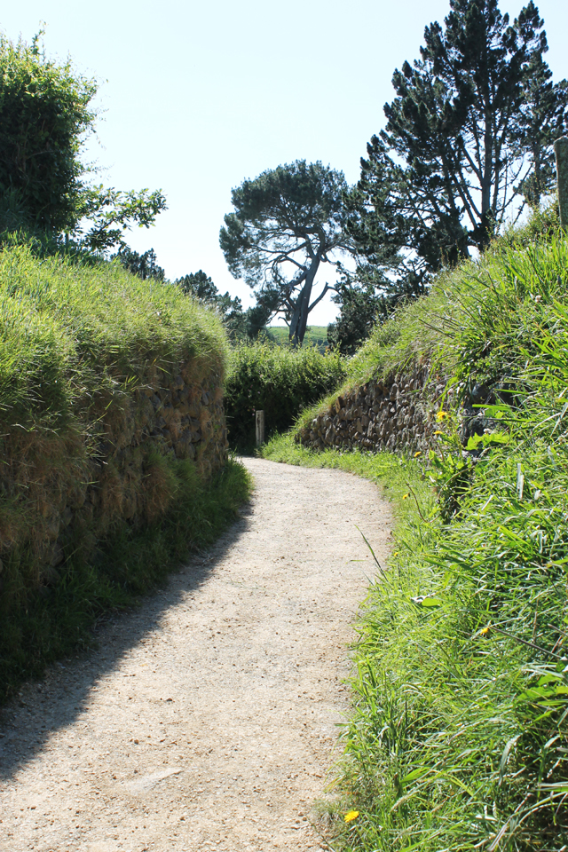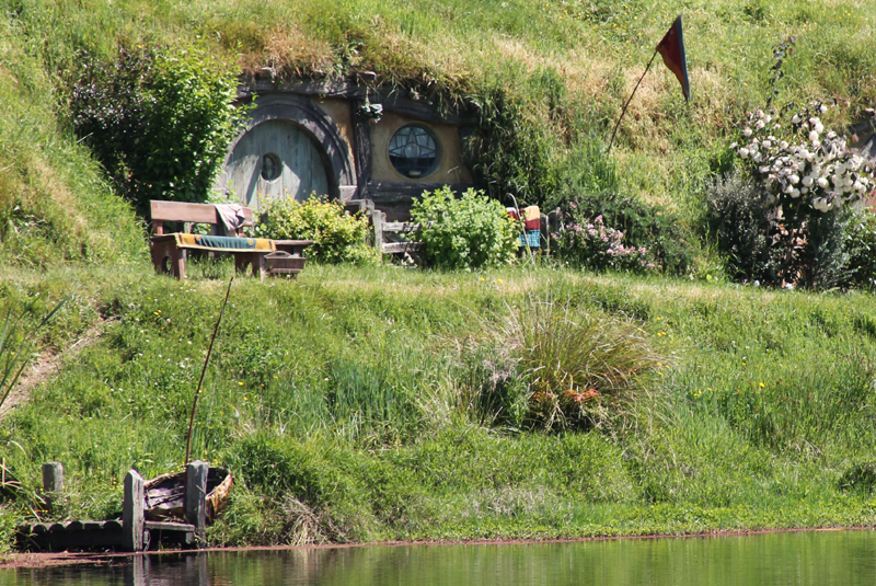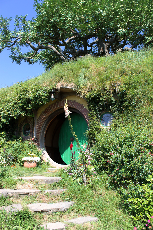Nach einigen weiteren Hobbithöhlen und dem Froschteich, gelangt man in den Teil der Anlage, der neu für die Hobbit-Filme angelegt wurde. Bisher ist dieser Bereich jedoch nicht in den Filmen zu sehen gewesen und so erhält man hier einen sehr exklusiven Einblick. Dann geht es den Bühl hinauf nach Beutelsend und man steht vor der berühmten grünen, kreisrunden Tür. Der Eingang wird von einer alten Eiche beschattet, dem einzigen künstlichen Gewächs vor Ort. Sämtliche Blätter wurden übrigens einzeln bemalt und am Baum befestigt. Von Beutelsend hat man einen schönen Blick über die ganze Anlage. Unter einem liegen der Platz mit dem Festbaum, dahinter der Fluss und See die „Wässer“, sowie das Gasthaus „Zum grünen Drachen“.