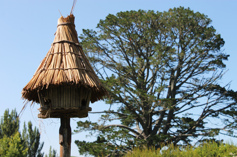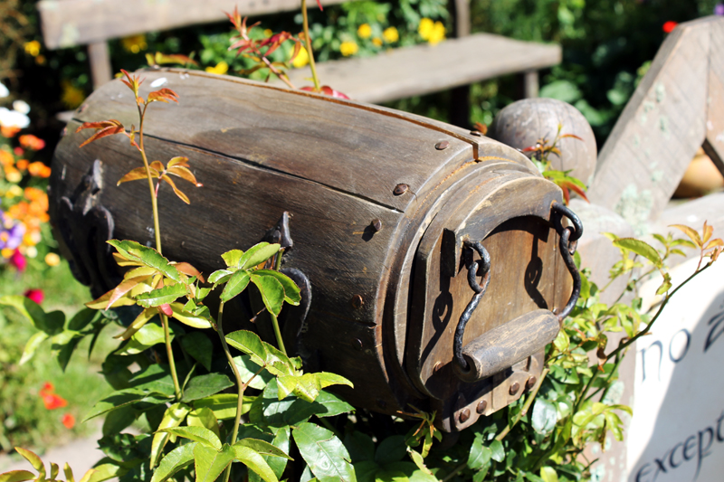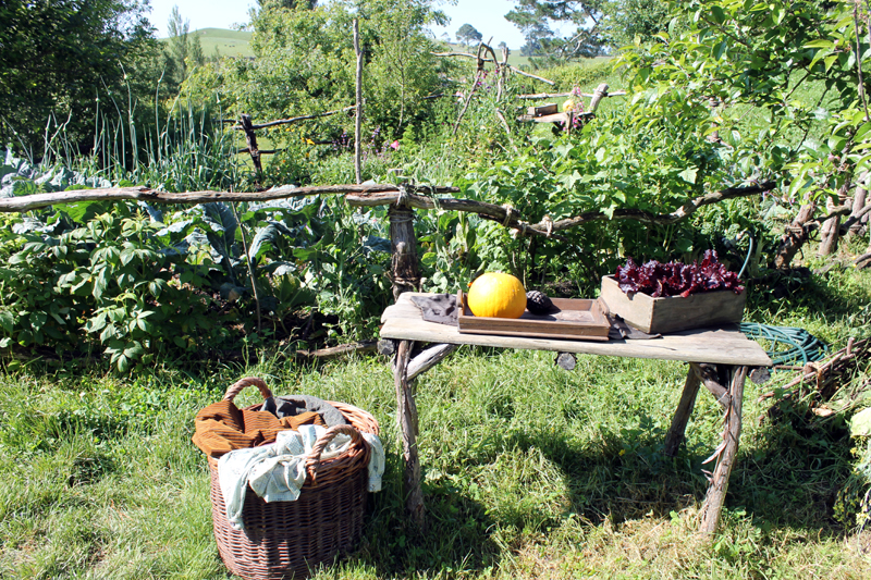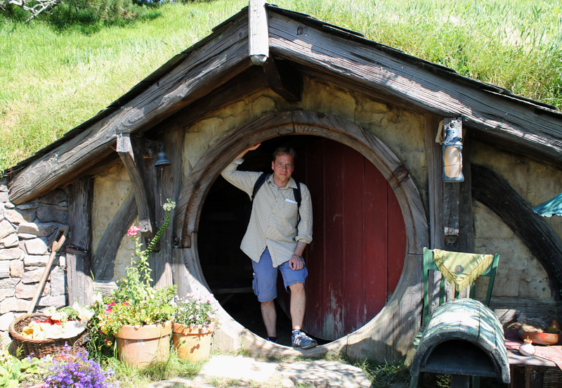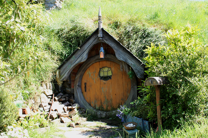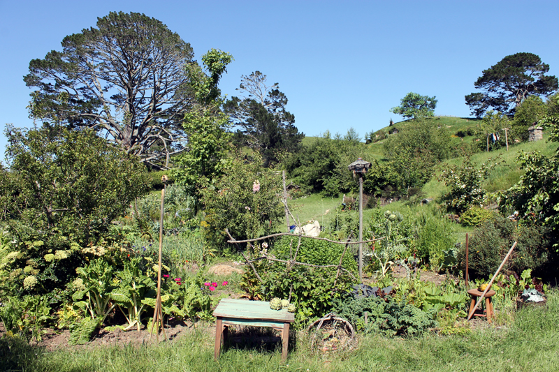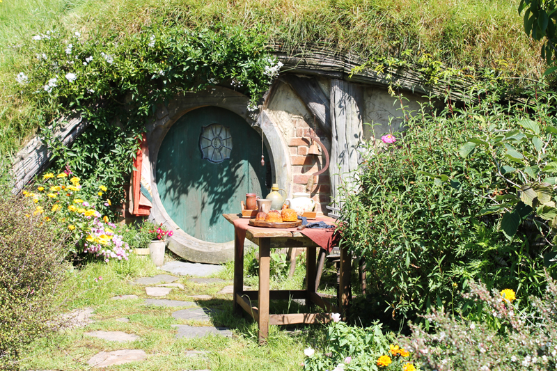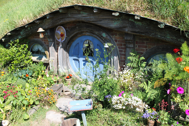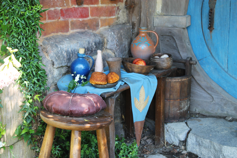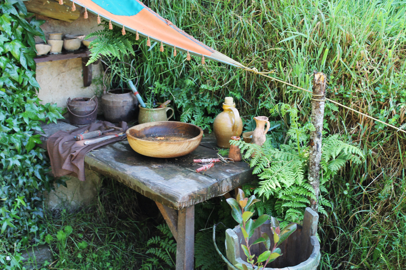 Neben der Eintrittskarte, erhält man auch eine kleine Karte von Hobbingen und so kann man sich recht gut orientieren. Gleich am Eingang liegen einige Hobbithöhlen und ein großer Gemüsegarten. Alle Pflanzen und Bäume sind echt und wachsen und gedeihen wirklich prächtig. Bei meinem Besuch im Frühjahr stand natürlich alles in voller Blüte und das Gras war saftig und grün. Was gleich zu Beginn auffällt ist, dass nicht alle Hobbithöhlen im gleichen Maßstab angelegt sind. So reicht die Größe von 60 über 80 bis schließlich 100 %. Jede der 44 Behausungen ist ganz individuell gestaltet und ausgestattet. Es gibt Höhlen reicher und armer Hobbits, welche in denen Handwerker oder Fischer, Bauer oder Töpfer wohnen. Im Laufe der Zeit wurde die Anlage mit immer mehr Details und Requisiten ausgestattet. Neben Stühlen und Bänken finden sich jetzt auch Flaschen, Kleidungsstücke und Lebensmittel vor den Eingängen. Auf den Feldern stehen Arbeitsgeräte, Heuhocken und Bienenkörbe. Die Gärten haben Komposthaufen und alles wirkt, als sei der Ort erst gerade von seinen Bewohnern verlassen worden. Der neuste Clou sind rauchenden Schornsteine, die just an dem Morgen unseres Besuchs zum ersten Mal in Gang gesetzt wurden. Ganz erstaunlich sind die Fülle der Details und die aufwendige Gestaltung der Objekte. Jeder Gegenstand ist mit Gebrauchspuren versehen und sämtliche Zäune sind mit Moos, Flechten und Rostflecken bemalt worden.