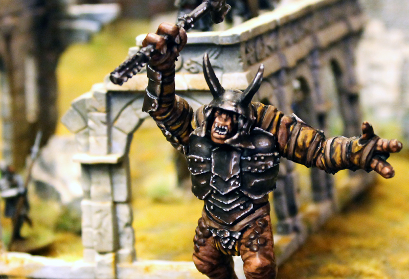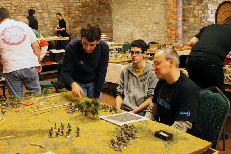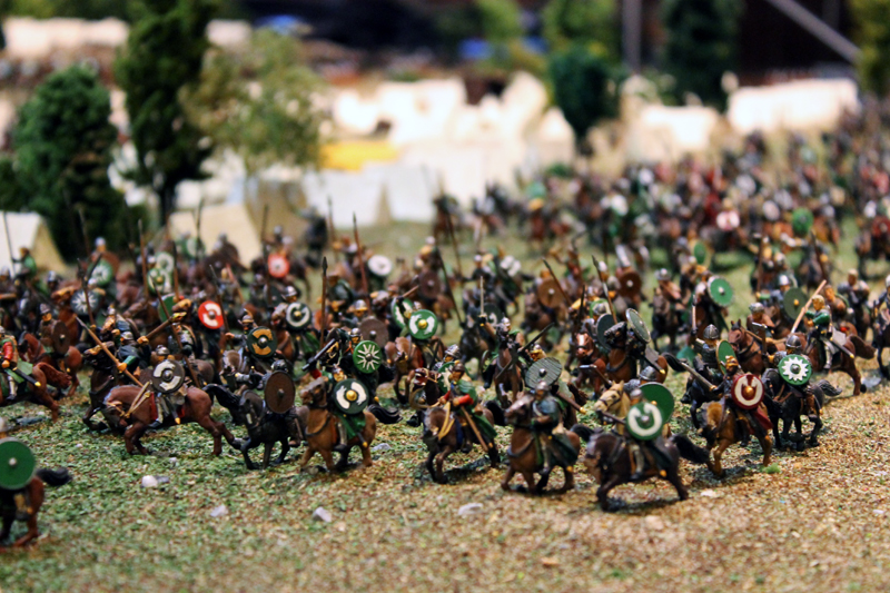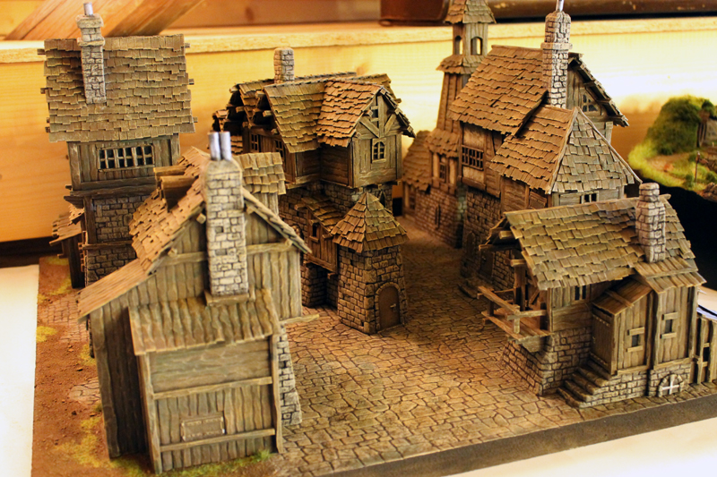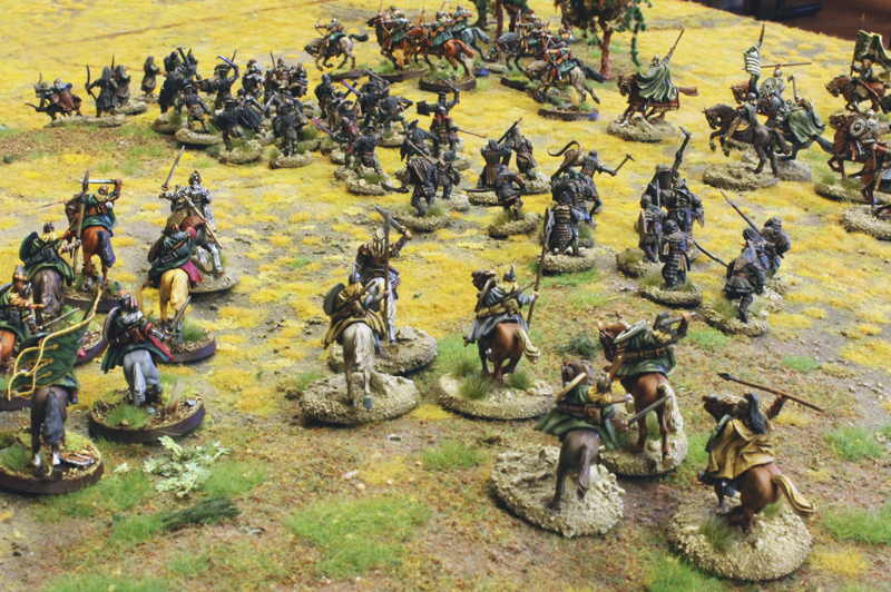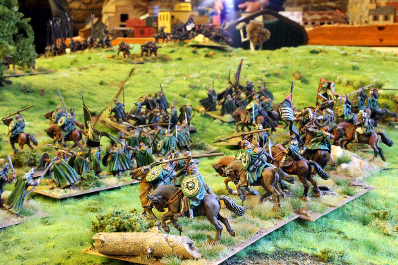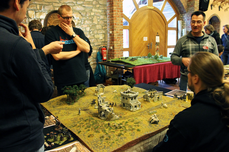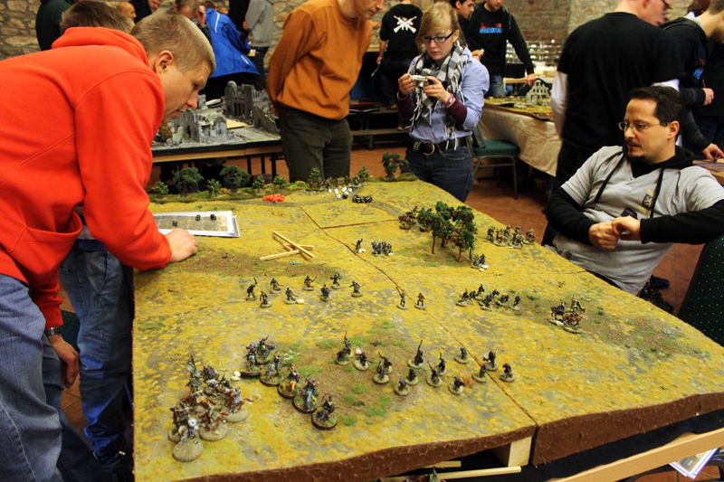 Neu war in diesem Jahr der Name der Veranstaltung: SZENARIO. Zum einen wollten die Organisatoren man damit klarstellen, dass es sich nicht nur um eine reine Herr-der-Ringe Veranstaltung handelt und es soll vor allem den erzählerischen Aspekt des TableTops in den Vordergrund stellen.  Ganz im Sinne dieses neuen Namens, hatte ich für meine Präsentation ein Szenario aus dem Der-Herr-der-Ringe Kapitel „Uruk Hai“ gewählt…die Verfolgung der Uruks durch die Reiter von Rohan bis zum Rand des Fangorn Waldes. An dieser Stelle vielen Dank an Jürgen, der hierfür eine große Zahl seiner wunderschön bemalten Reiter zur Verfügung gestellt hat. Das Ganze wurde nach den SAGA Regeln gespielt, welche auf dieser Veranstaltung an vielen der Spieltische zu finden war. An den Nachbartischen tobten beispielweise SAGA-Gefechte in den Ruinen von Osgiliath (präsentiert von Frank & Martin) und in einem japanischen Dorf (präsentiert von Patrick). Aber auch das klassische SAGA, welches in den dunklen Zeiten der Wikinger spielt, fehlte nicht (präsentiert von Jürgen). Eine reine Augenweide waren aber auch die „RINGKRIEG“ Präsentation und die Schlacht an den Furten des Isen, welche mit den beliebten IMPETUS Regeln ausgetragen wurde. Aber auch auf das „klassische“ HdR-TableTop mussten die Besucher nicht verzichten, denn in der wunderschönen „Osgiliath“ Platte vom „Ninjameister“ durften die GW-Puristen ihre Figuren durch das Gelände schieben. Extrem beeindruckend und sehr unterhaltsam war für mich die „MKB Marcouf“ – Präsentation von „Rusus“. Zum einen, weil ich das Gelände dieser Marine-Küstenbatterie schon einmal selbst besucht hatte, zum anderen, weil Thomas beim Nachbau dieser Anlage einfach unglaublich gute Arbeit geleistet hatte. Auch die Regeln (Victory Decision) und das ungewöhnliche Szenario passten ungemein gut zu diesem Kapitel des 2. Weltkrieges. Gleich nebenan wurden in „Nordafrika“ Panzer nach den FLAMES OF WAR Regeln bewegt. Natürlich war auch der „Wilde Westen“ vertreten…Tim präsentierte eine sehr stimmige Stadt dieses Genres.