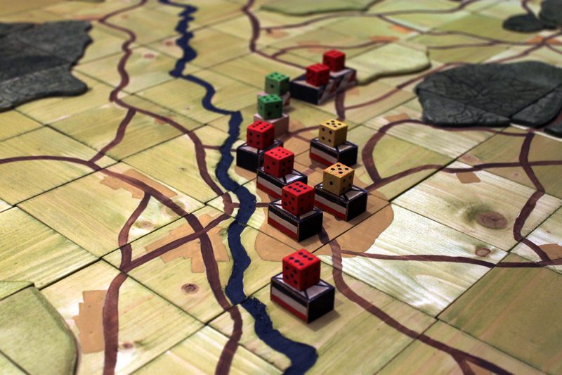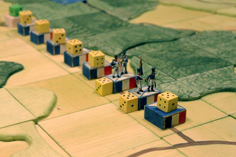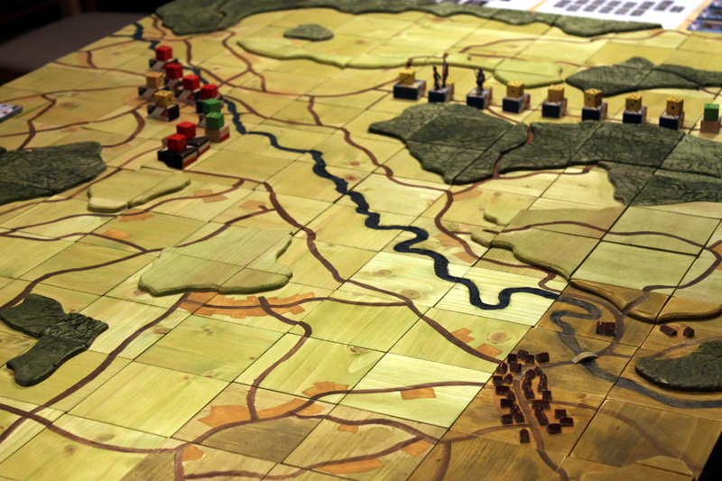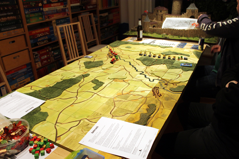 Nach dem Abendessen durfte ich dann schon einmal ein Testspiel der neusten Kreation von Rusus absolvieren. Es ging dabei um die Schlacht von Wavre, welche im Rahmen des Feldzuges von 1815 zwischen den Preußen und Franzose ausgefochten wurde. Bei diesem Spiel handelt es sich strenggenommen nicht um eine TableTop, sondern um ein Brettspiel. Grundidee des Ganzen ist, diese Bewegungsschlacht auf einer gemalten Landkarte stattfinden zu lassen. Dazu hat Rusu eine Reliefkarte aus Holzquarten entwickelt. Das Szenario und die Spielregel sind ebenfalls eine eigene Entwicklung. Viel mehr will ich jetzt aber dazu gar nicht verraten, denn das Feintuning folgt ja erst noch. Trotzdem hat mich das Szenario schon sehr begeistert! Das wird bestimmt ein Highlight der nächsten Tactica.
