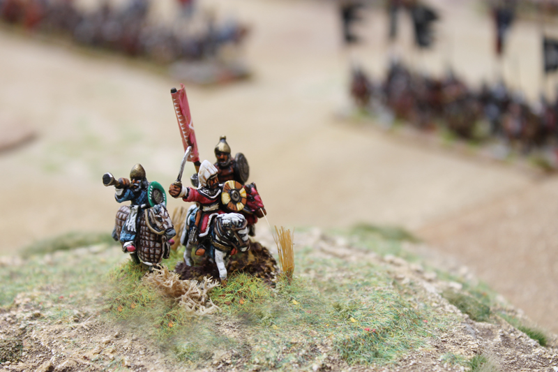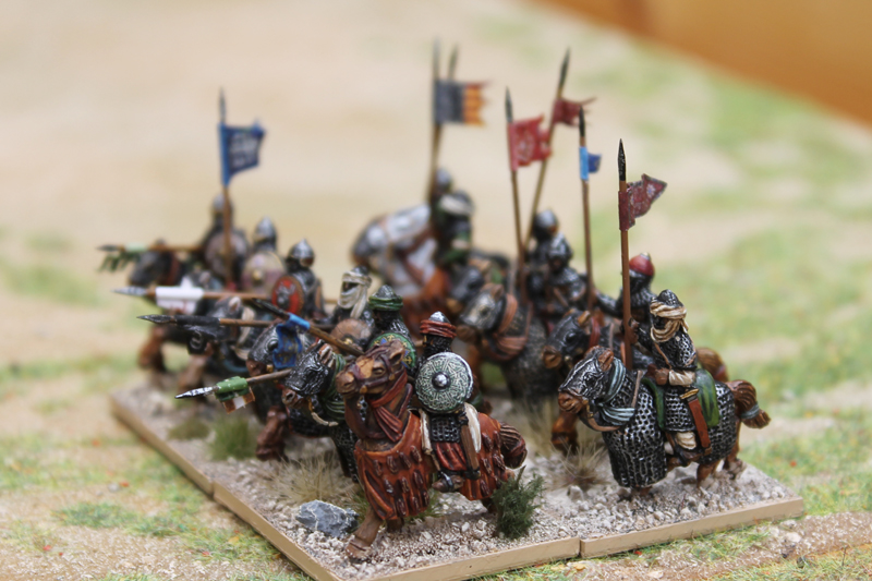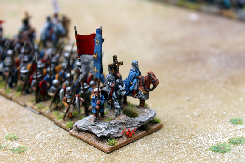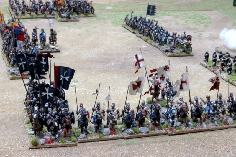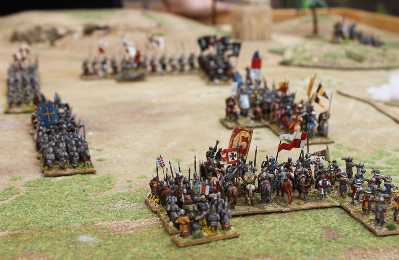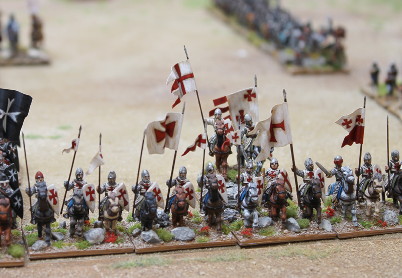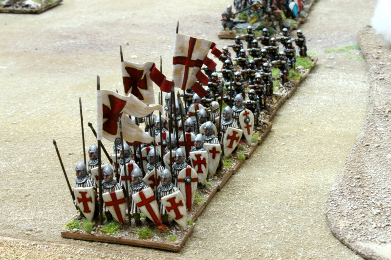 Am nächsten Tag konnte ich noch zusammen mit Jürgen von den Kurpfälzern das Heer der Kreuzfahrer in der Schlacht von Hattin führen. In diesem Field of Glory Szenario mussten sich unsere Truppen ihren Weg aus der in Brand gesetzten Ebene zu den Hörner von Hattin bahnen. Da unsere Mannen durch die Ungläubigen schon einige Zeit durch die Wüste gehetzt worden waren und wir jede Wasserstelle durch den Feind besetzt vorfanden, schlichen wir nur noch erschöpft über das Schlachtfeld (Bewegung -1 für alle Truppen). Doch durch das wahre Kreuz fassten wir Mut und schöpften Hoffnung auf einen siegreichen Ausgang (+2 auf alle Test in 12 MU Reichweite um das Kreuz). Trotz des mörderischen Beschusses und der unablässigen Reiterangriffe hieben wir uns den Weg frei und auch wenn viele unserer Brüder auf dem Schlachtfeld blieben, konnten wir schließlich den Sieg erringen. Neben dem tollen Szenario müssen vor allem die großartigen Figuren Erwähnung finden. Ich bin sonst kein großer 15mm Fan, aber diese Truppen waren extrem eindrucksvoll.