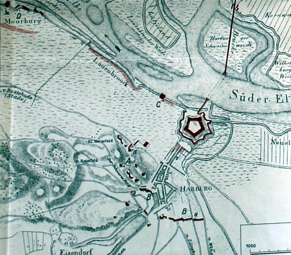 Die kleine Stadt Harburg liegt am südlichen Ufer der Elbe, gegenüber der Stadt Hamburg. Der Ort wird eingerahmt vom Schwarzen Berg im Westen, dem Krummholzberg im Süden, der Winsener Marsch im Osten sowie der Elbe mit dem Stromspaltungsgebiets im Norden. Harburg entwickelte sich einst auf Grund der Fährverbindung nach Hamburg und dem damit verbundenen Fracht-, Personen- und Postverkehrs. Im Jahr 1297 erhielt Harburg das Stadtrecht und wurde 1527 Residenz einer Nebenlinie des Hauses Braunschweig-Lüneburg. 1642 fiel das Amt Harburg an die Celler Hauptlinie der Welfen zurück. Seit 1705 gehörte die Stadt zum Kurfürstentum Braunschweig-Lüneburg. Als im Jahr 1803 England und Hannover in den Krieg gegen Napoleon eingetreten waren, marschierte die französische Armee gegen das Kurfürstentum, welches sich kampflos ergab. Im Juni 1803 rückten französische Truppen in Harburg ein und blieben dort sowie in den umliegenden Dörfern bis zum Herbst 1805. Im Jahr 1806 rückten preußische Besatzer, die zu diesem Zeitpunkt noch mit Frankreich verbündet waren, in die Region. Doch noch im selben Jahr, unmittelbar nach der Niederlage der Preußen in den Schlachten von Jena und Auerstedt, marschierten erneut Franzosen in Harburg ein. Im Jahr 1807 fiel die Stadt an das Königreich Westfalen, welches von Napoleons jüngstem Bruder Jérôme regiert wurde. Von 1811 bis zum sechsten Koalitionskrieg gehörte Harburg schließlich zum Departement Elbmündungen als Teil des französischen Kaiserreiches. Im Jahr 1814, nach langer Belagerung durch die Alliierten, fiel die Stadt schließlich an das neugegründete Königreich Hannover.