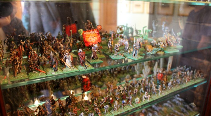 Nun aber zurück zu Tag drei. Am frühen Morgen fuhren wir mit Alan und Michael nach Stoke Hall, dem Sitz von Wargames Foundry. Und da erwartete uns einiges! Nach einer guten halben Stunde Fahrt erreichten wir, eingebettet zwischen Feldern, dem Städtchen Newark und dem Fluss Trent, das Anwesen der Familie. Und damit meine ich kein kleines Landhäuschen! Hinter einer hohen Mauer, einem elektrischem Eisengittertor und einer filmreifen, kreisrunden Kiesauffahrt stoppen wir unsere Fahrzeuge vor einer schlossähnlichen Anlage. Am Portal wurden wir von Diane Ansell begrüßt und in die Eingangshalle geleitet. Hier empfing uns schließlich die Wargaming Legende Bryan Ansell. Bryan Ansell und Games Workshop wurden 1979 Partner und gründeten unter anderem die Firma Citadel Miniatures. Ab 1985 wurde er Managing Director von Games Workshop, verkaufte später GW an Tom Kirby und konzentrierte sich schließlich auf die Produktion von historischen Miniaturen unter dem Label Wargames Foundry. Bei einem Kaffee im Wintergarten lauschten wir andächtig den vielen interessanten Geschichten und bestaunten immer wieder die zahllosen Vitrinen mit ihren bemalten Figuren. Schließlich wurden wir von Bryan zu einem Rundgang durch das Anwesen eingeladen. Zunächst ging es durch den prächtigen Garten, durch ein Tor mit Glockenturm, bis wir die alten Wirtschaftsgebäude und die Pferdeställen erreichten. In diesem Areal befinden sich jetzt die Verkaufsräume, die Werkstätten und die Produktion von Foundry. Im Innenhof wurde ein großes Zelt mit Bar und Spieltischen aufgestellt… quasi dem Gegenstück zur Warhammer World. Das Ganze ist auch für Besucher zugänglich. Nach dem Rundgang wurden wir an die große Tafel im Esszimmer gebeten, wo Diane schon einen leckeren Lunch aufgetischt hatte. Besonders der Victoria Sponge Cake mit flüssiger Sahne sorgte dafür, dass wir den Rest des Tages ohne weitere Nahrung überstehen konnten.