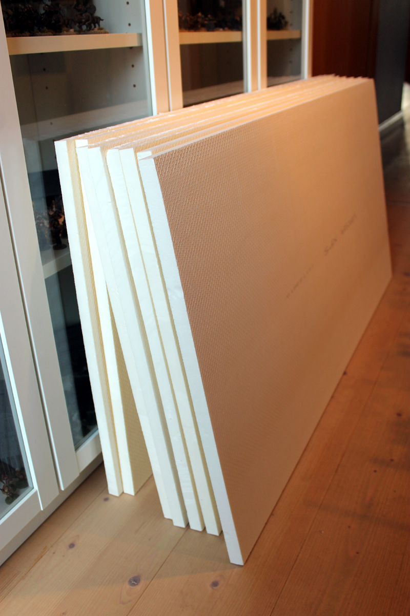 Im ersten Schritt werden die Styrodurplatten auf jeweils 58 x 118 cm zurecht geschnitten, da jede Platte am Ende, zusammen mit den Holzleisten, die Maße von 60 x 120 cm aufweisen soll. Geschnitten werden die Platten mit einem guten Cutter (Teppichmesser) mit möglichst breiter Klinge. Man sollte bei dieser Arbeit eine Führung für das Messer verwenden, damit die Schnittfläche am Ende gleichmäßig und ohne Schrägen ausfällt. Ich verwende dazu beispielsweise zwei MDF Arbeitsplatten, die oberhalb und unterhalb der Styrodurplatte liegen und mit ihren parallel zueinander ausgerichteten Kanten eine ideale Führung bilden.