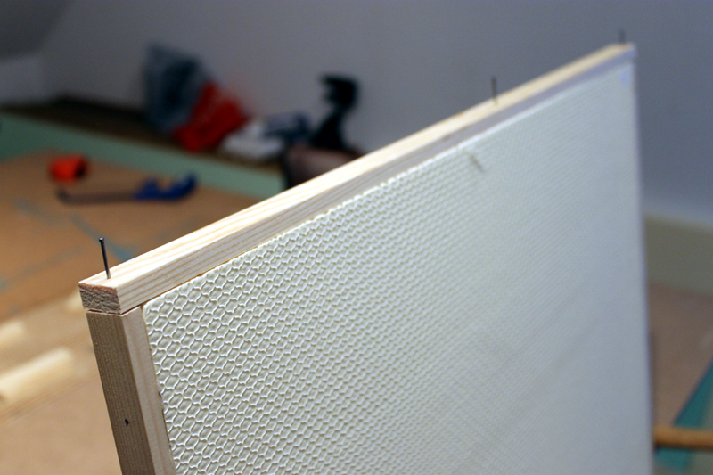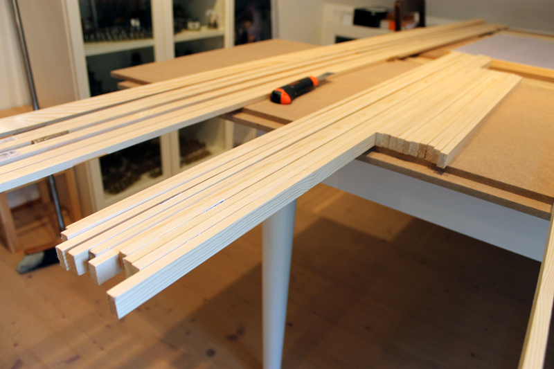 Nach dem Zuschneiden werden alle Platten mit einem Holzrahmen versehen. Das dient dazu, die empfindlichen Kanten der Styrodurplatten vor Abnutzung zu schützen und die Platten insgesamt etwas stabiler zu machen. Ich verwende für den Rahmen 1 cm x 2 cm Holzleisten, weil man in dieser Stärke noch Verbindungsnägel über Eck einschlagen kann. Bei dünneren Leisten kann sich das Holz außerdem spalten oder der Nagel tritt seitlich aus. Die Leisten werden zunächst auf Maß gesägt. Die kurzen Seiten erhalten dabei eine Länge von 60 cm, die Längsseite eine von 118 cm. Die dünnen Nagelstifte werden vorab schon einmal so weit wie möglich in die Leisten eingeschlagen. Dann wird Leim (nicht zu viel, ein dünner Streifen genügt) auf die erste Längsseite der Styrodurplatte aufgetragen, die Holzleiste aufgelegt und schließlich die Nägel in die Dämmplatte getrieben. Die Platte wird gedreht und dieser Vorgang wiederholt sich an der anderen Längsseite. Achtung! Man sollte dabei beachten, das die Holzleisten auf einer Seite absolut bündig mit der Plattenoberfläche abschließen, denn leider sind die Platten nicht immer exakt 2 cm dick, sondern meist 1 bis 2 mm stärker. Durch die Nägel wird übrigens jetzt noch keine stabile Verbindung hergestellt, sie dienen nur dazu, ein Verschieben der Holzleisten zu verhindern. Nun werden die kurzen Leisten angebracht. Dabei wird zunächst je eine Nagel an jeder Ecke, dort wo die kurzen Leisten die längeren überlappen, eingeschlagen. Durch diese 4 Nägel, welche die Holzleisten direkt verbinden, ist der Rahmen jetzt schon sehr stabil. Sobald der Leim getrocknet ist, ist auch das Holz mit dem Styrodur fest verbunden und die Platte kann bearbeitet werden. Mit einem Schleifblock werden die Holzkanten noch einmal geglättet und die Platten werden probeweise nebeneinandergelegt. Es sollten jetzt keine Lücken zwischen den Platten erkennbar sein.