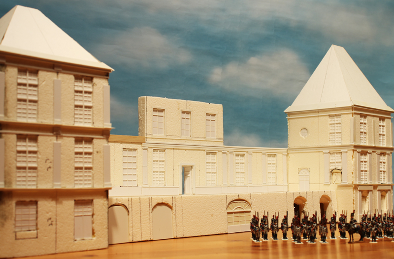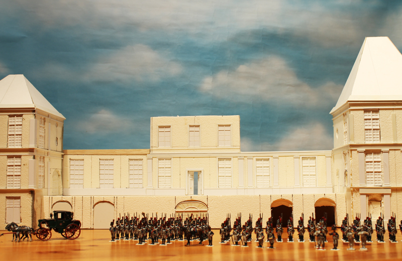 Nachdem das Projekt halb fertig einige Jahre auf meinem Dachboden verbracht hatte, soll es nun zu neuem Leben erweckt werden. Der Plan sieht vor, es spätestens bis zum Jahrestag am 20. April 2014 fertigzustellen. Nachfolgend zunächst eine kleine Bestandsaufnahme in Bildern. Die Bemalung der Figuren ist schon recht weit vorangeschritten. Fertiggestellt sind ungefähr 400 Figuren und die Kutsche Napoleons. Begonnen ist auch die Fassade des Schlosses und die Recherche und für die Tete de Colonne der Garde Grenadiere. Unterstützt wurden wir außerdem von Frank Germershaus, der uns eine Grundfigur für die Musiker modelliert hat, doch dazu später mehr. Hier also die ersten Fotos.