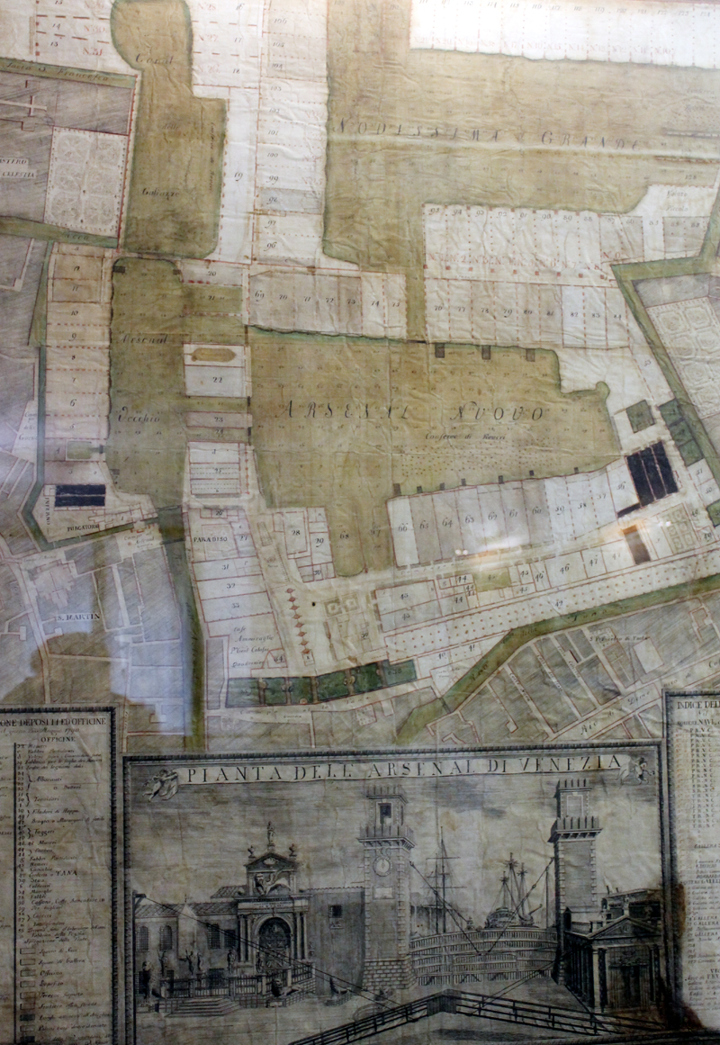 Die alte Schiffswerft und der Kriegshafen der Stadt Venedig, das Arsenal, ist bis heute militärisches Gelände und somit eine verbotene Zone. Einzig die Mauern und das mächtige Einfahrtstor lassen sich besichtigen. Die Schiffswerft war einst die modernste der Welt. Die Bestandteile für die Kriegsgaleeren die hier gebaut wurden, waren genormt. Sie wurden vorgefertigt im Depot gelagert, so dass in kürzester Zeit 25 Schiffe einsatzfertig gemacht werden konnten. Vor der Schlacht von Lepanto gegen die Türken wurden im Arsenal im Jahre 1570 innerhalb von zwei Wochen 100 Galeeren gebaut. Das Arsenal war und ist von Mauern und Türmen umgeben, wie bei einer Festung, Bis zum Jahr 1806 gab es nur zwei Eingänge. Unter Napoleon wurde das Arsenal zu dieser Zeit zu einer modernen Schiffswerft umgebaut.