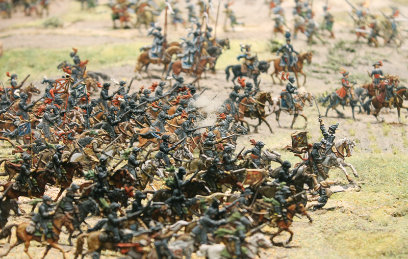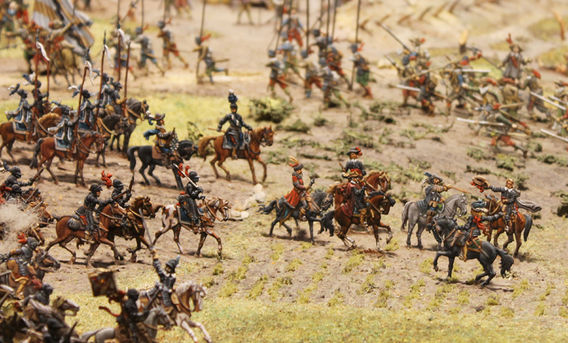 Das bayrische Regiment Cronberg, die „Unüberwindlichen“ genannt, ritten allesamt schwarze Pferde, trugen schwarze Bekleidung und am schwarzen Helm einen weißen Totenkopf (Bild: Ausschnitt aus dem  Diorama „Schlacht bei Lutter a. B.“ / Zinnfigurenmuseum Goslar).