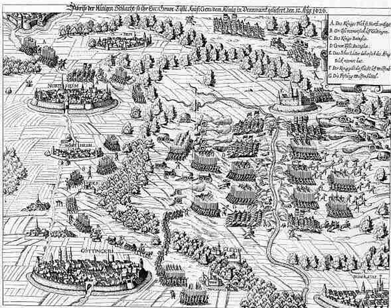 Der Kampfhandlungen begannen am Morgen des 27. August 1626 um 10 Uhr, als Tilly die drei schweren Kavallerieregimentern Des Four, Altsachsen und Haußmann auf ihren bereits erwähnten Flankenmarsch auf der rechten Seite schickte. Um dem Flankenmarsch etwas Zeit zu geben, eröffnete die Batterie der Katholischen Liga das Feuer erst gegen 11 Uhr.