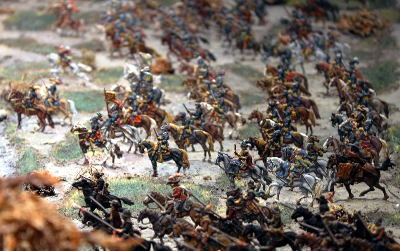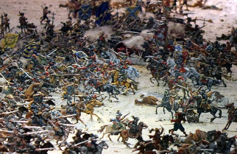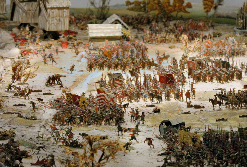 Im Schlossmuseum ist auch ein großes Diorama mit Flachfiguren untergebracht. Das Diorama ist leider in einem nicht so guten Zustand und die Beleuchtung ist auch nicht optimal. Ich habe trotzdem mal ein paar Fotos geschossen, da man hier gut alle Geländemerkmale und Schlachtereignisse im Zusammenhang sieht.