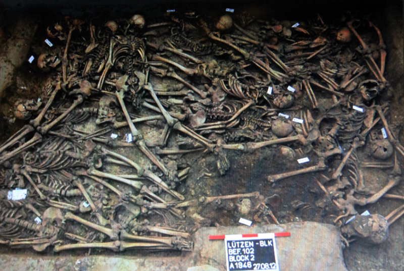 Auf der linken Straßenseite, gegenüber der Gustav-Adolf Gedenkstätte, sieht man die Felder, auf denen einst die Kaiserlichen Truppen ihre Schlachtreihen aufgestellt hatten. Das Schlachtfeld, wie auch die gesamte Gegend sind übrigens flach wie eine Schallplatte. Wenn man in Berichte von Hügel, wie zum Beispiel dem Windmühlenhügel liest, dann sind damit lediglich Bodenerhebungen von maximal 1 bis 1,5 Metern gemeint. Östlich der Straße, rund um die Gedenkstätte erhebt sich heutzutage ein Wald, in dem man einen Kletterpark und ein Tiergehege findet. Hier gab es im Jahr 1632 nur offene Flächen. Folgt man der Straße weiter nach Norden, so stößt man an den Floßgraben. Dieser Kanal wurde zwischen 1578 bis 1587 angelegt, um Holz über längere Strecken zu transportieren. Heute ich der Wasserlauf nur noch ein kleines Rinnsal, einst war er aber ein größeres Hindernis und verzögerte 1632 den Truppenaufmarsch der Schweden, deren Armee den Kanal auf dem Weg zum Schlachtfeld überqueren musste. Der Floßgraben begrenzt das Schlachtfeld im Nordosten, schlägt einen weiten Bogen im Osten und vereinigt sich im Südosten mit dem Mühlgraben, welcher das Schlachtfeld im Südwesten begrenzt. Ich habe übrigens im Ort direkt am alten Mühlgraben der jetzt Ellerbach heißt, zu Abend gegessen. Direkt am Ufer liegt jetzt ein griechisches Restaurant mit kleinem Biergarten. Nahezu unverändert findet man das Schlachtfeld im Süden, wo die Schweden ihre Truppen aufmarschieren ließen. Folgt man hier der Straße durch die Felder, gelangt man nach Meuchen, wo am Ortseingang noch immer die alte Kirche zu finden ist. In dieses Gotteshaus wurde nach der Schlacht der Leichnam König Gustav II. Adolf von Schweden gebracht und aufgebahrt. Nach der Reinigung des Körpers, wurde der König in das Geleithaus im nahegelegenen Weißenfels überführt.