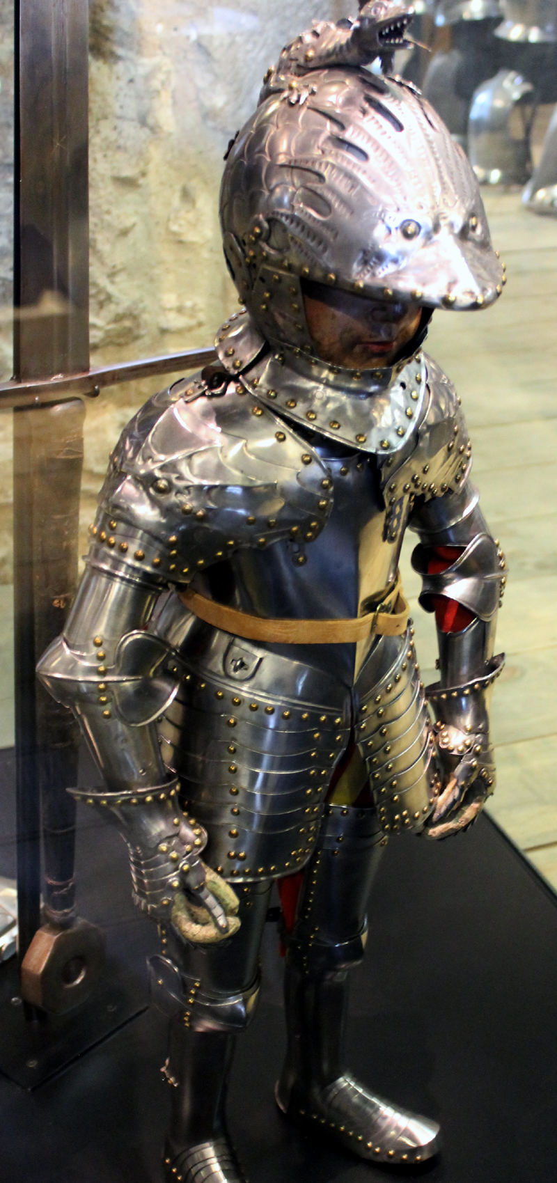 Diese Feldrüstung für einen jungen Mann, die überaus kunstvoll gearbeitet ist und vollständig vergoldet wurde, war ursprünglich für Henry den Prince of Wales angefertigt worden. Der junge Prinz starb jedoch bevor die Rüstung vollendet wurde. Die Rüstung wurde also an seinen Bruder den späteren König Charles I. weitergereicht.