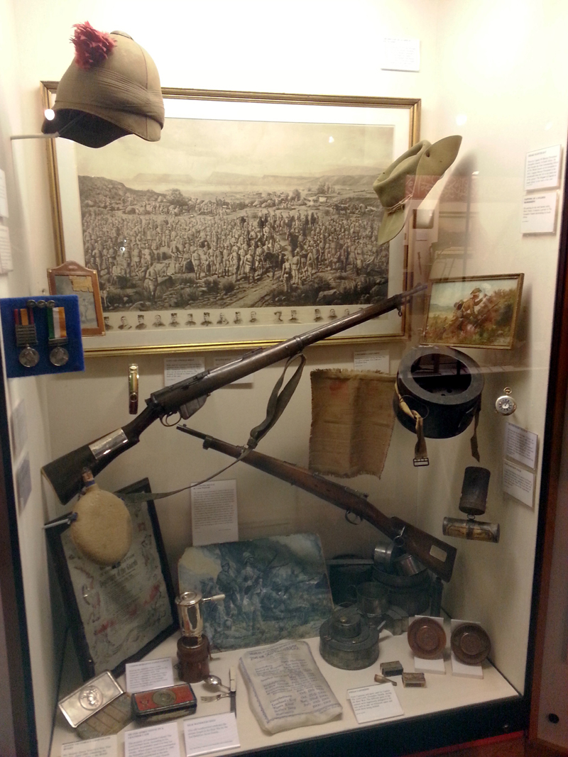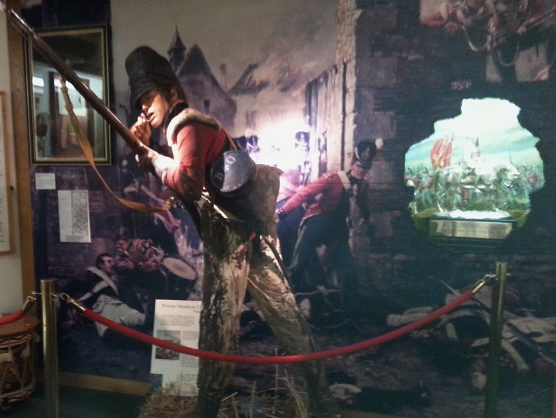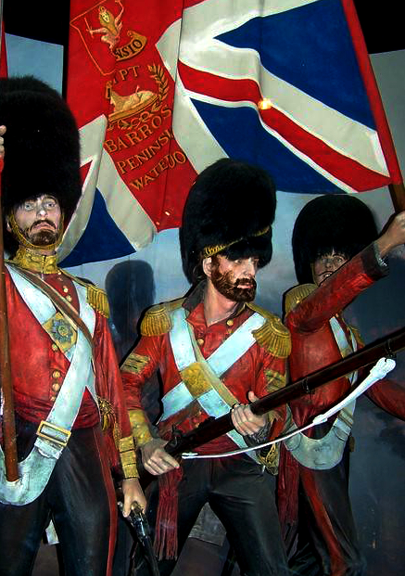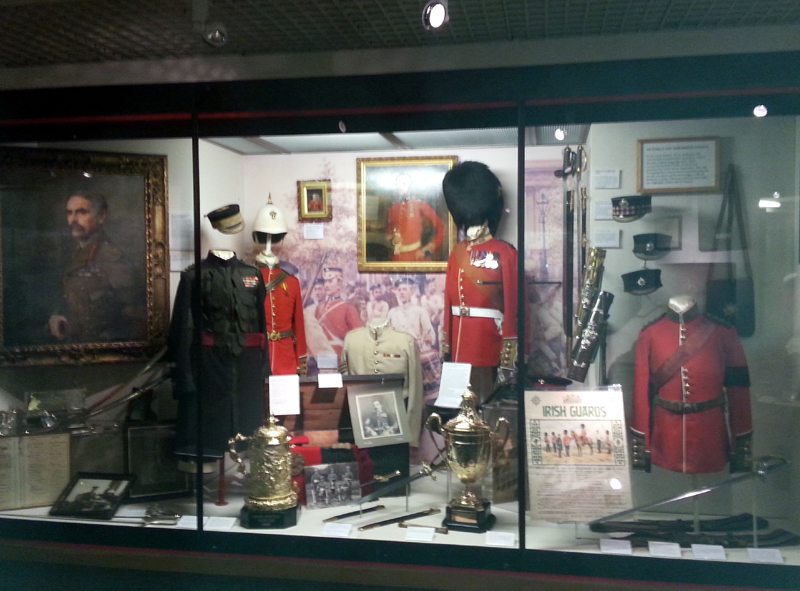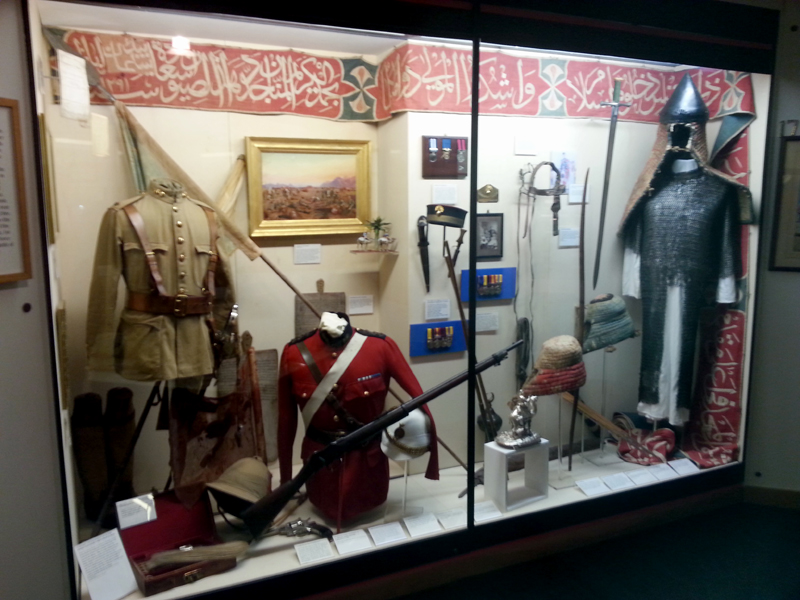 Das Guards Museum findet man am Rande des St. James Parks in dem Areal der Wellington Barracks. Hier wird die Geschichte der Grenadier Guards, Coldstream Guards, Scots Guards, Irish Guards und der Welsh Guards erzählt. Nach einem kurzen Film, der die Uniformunterschiede der Regimenter erklärt, beginnt die Ausstellung mit den Anfängen der Garde im Englischen Bürgerkrieg. Im weiteren Verlauf wird in jeweils einer großen Vitrinen-Wand durch einige ausgewählten Ausstellungsstücke ein bestimmter Zeitabschnitt bzw. ein Feldzug geschildert. Der spanische Erbfolgekrieg ist mit der Schlacht von Blenheim vertreten und gleich im Eingangsbereich trifft man auf lebensgroße Fahnenträger der Garde, die so in einem bekannten Gemälde zur Schlacht von Alma im Krimkrieg dargestellt sind. Für mich von besonderem Interesse war die Ausstellung zur Schlacht von Waterloo und natürlich zu meinem Lieblingsthema, dem Mahdi-Aufstand im Sudan. Zum Thema Waterloo findet man einige ungewöhnliche Artefakte, welche die Verteidigung des Schlosses Hougoumont betreffen. So sind das Türschloss, Kette und einige Holzfragmente des Nordtores zu sehen (s. auch mein Bericht zu Hougoumont: https://tabletopdeutschland.wordpress.com/2015/10/07/hougoumont-2015/ ). Ebenso Teile der Balustrade, die zwischen Gemüsegarten und Ziergarten verlief. Natürlich auch Uniformteile und Waffen die in dieser denkwürdigen Schlacht verwendet wurden. Zum Thema Sudan findet man die Spitze des Zeltes des Kalifen Abdulahi sowie Zeltschmuck, Waffen, Rüstungen und Fahnen vom Schlachtfeld von Omdurman. Auch einige sensationelle Ausstellungsstücke zum Camel Corps, wie die Fahne einer Kompanie sind zu sehen.