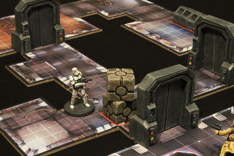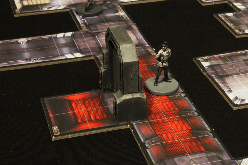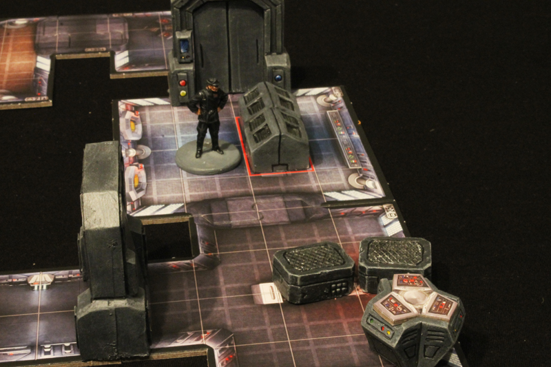 Das letzte Set stellt das Innere einer imperialen Station oder eines Raumschiffes dar. Auch verschiedene Innenräume des Todessterns lassen sich damit bespielen. Neben einem großen Hangar gibt es verschiedene Kontrollräume, eine Medistation und eine Inhaftierungsebene. Mit dieser Spielwelt möchte ich auch die Türen, Konsolen und Kisten von Combatzone Scenery vorstellen, die universell für alle Welten eingesetzt werden können. Die Computerkonsolen lassen sich außerdem mit den farbigen Markern aus dem Originalspiel verbinden. Das ist für einige Szenarien wichtig, da die Marker teilweise umgedreht werden müssen. Die Türen lassen sich aus den Türrahmen entfernen und zeigen so an, ob die jeweilige Tür offen oder geschlossen ist.