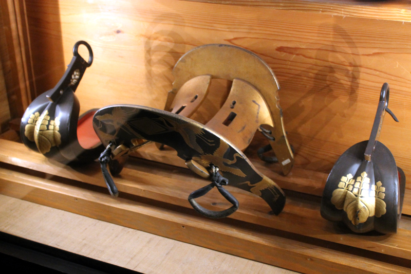 Diese Objekte stellen Sättel (Kura) und Steigbügel (Abumi) aus Holz dar. Außerdem sind das typische farbiges Zaumzeug und Pferdegeschirr zu sehen.