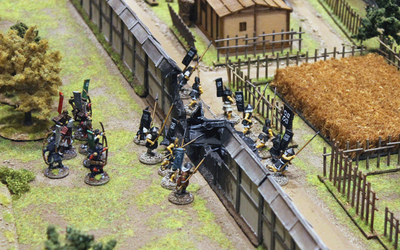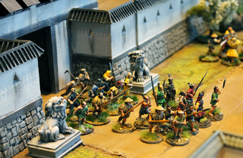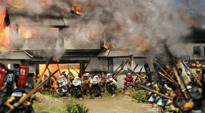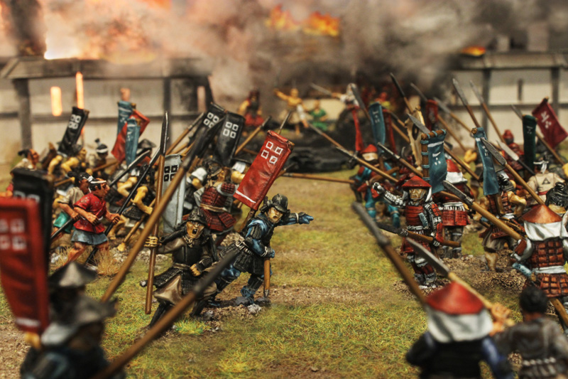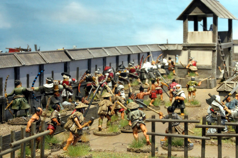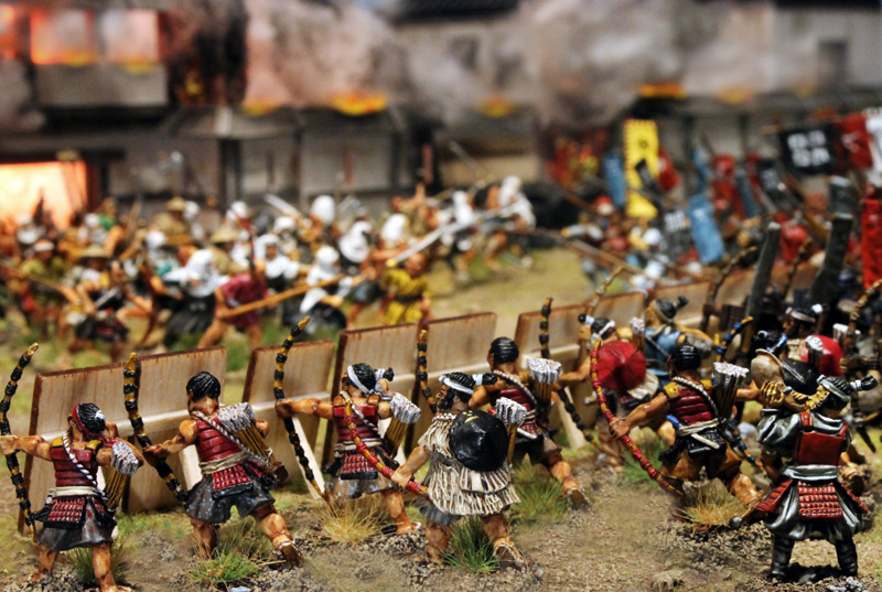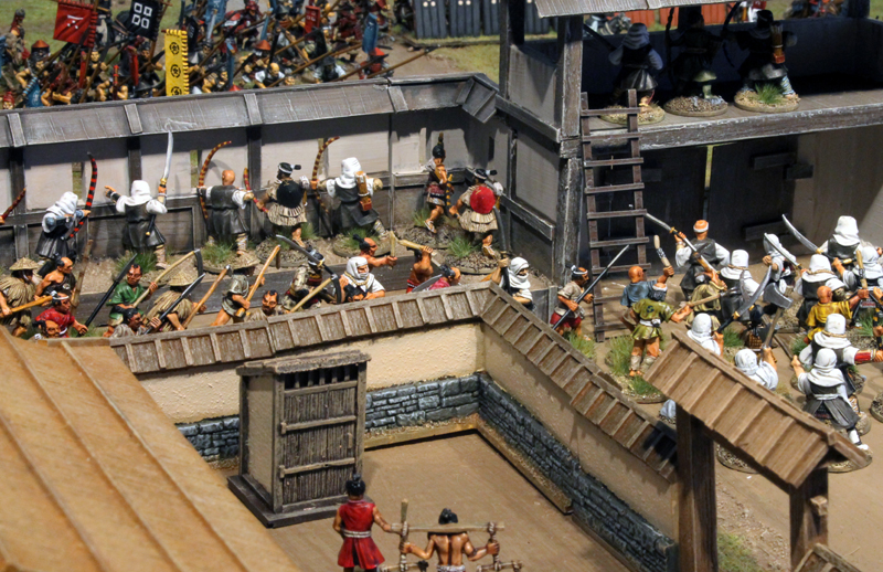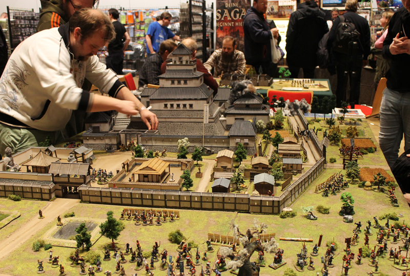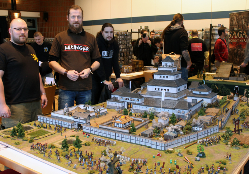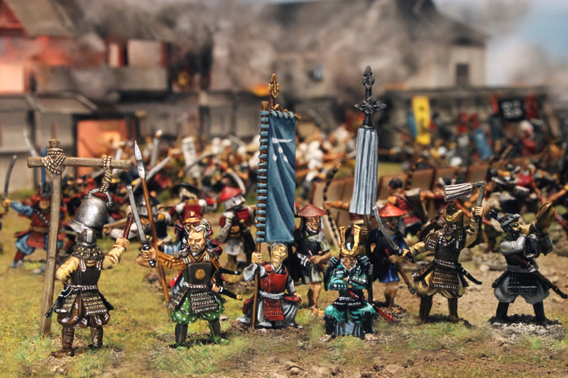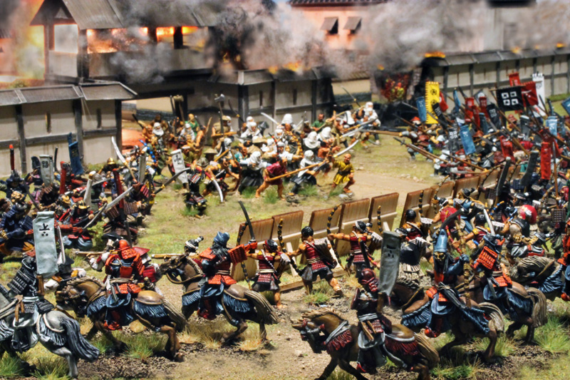 Gespielt wurde nach den SAGA Regeln und mit den großartigen Zen-SAGA Battleboard von Patrick. Bei diesem gigantischen 12-Punkte Spiel standen rund 250 Figuren auf dem Tisch (auch wenn nicht alle eingesetzt wurden). Im Szenario ging es um die historische, dritte Belagerung von Nagashima.