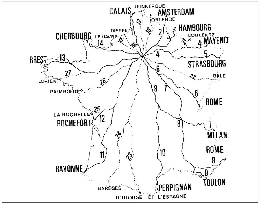 Wie vielen anderen Herrscher vor und nach Napoleon, die ihre Macht in großen Teilen militärisch durchsetzen, war auch ihm völlig klar, dass schnelle Verbindungswegen eine unbedingte Notwendigkeit darstellten. So schuf Napoleon am 16. Dezember 1811 aus den bereits bestehenden oder im Bau befindlichen großen Straßen seines Reiches ein Netz von sogenannten Kaiserstraßen, den „routes impériales“. Die wichtigsten dieser Straßen erhielten die Nummern 1 bis 14. Sie begannen am Portal von Notre-Dame in Paris und führten von hier in alle Himmelsrichtungen. Die zweitklassigen Straßen mit den Nummern 15 bis 27 verbanden die Hauptstadt Paris mit ihrer näheren Umgebung. Die Nummern 28 bis 229 blieben den drittklassigen regionalen Verbindungsstrecken vorbehalten.
