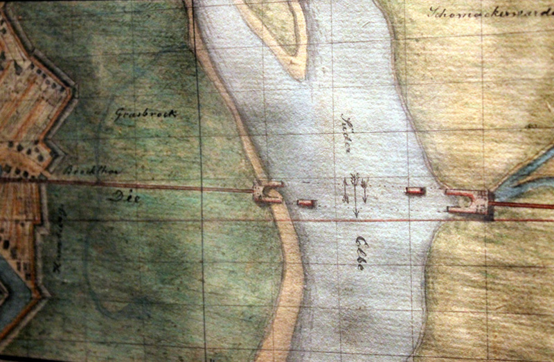 Eine erste Elbbrücke gab es von Harburg nach Hamburg erst ab 1872. Trotzdem muss an diese Stelle auf die kombinierte Brücken-Straßen-Fähr –Verbindung von Hamburg nach Harburg eingegangen werden, die von den Franzosen im Jahre 1813 in einer Rekordzeit von nur 3 Monaten bzw. 100 Tagen fertiggestellt wurde. Das Bauwerk wird noch heute allgemein mit der ersten „Elbbrücke“ Hamburgs betitelt, überbrückt wurden allerdings nur die feuchten Marschgebiete des Stormspaltungsgebietes und nicht die Flussarme der Norder- und Süderelbe.