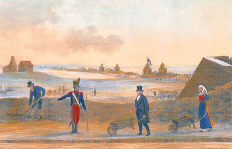 Hamburger Bürger bei Schanzarbeiten. Im Hintergrund ist gut der Kommunikationsweg erkennbar