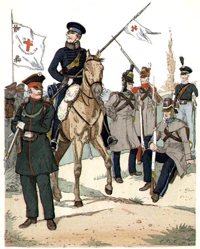 Ganz rechts ist eine Jäger der Ruissisch-deutschen Legion zu sehen.