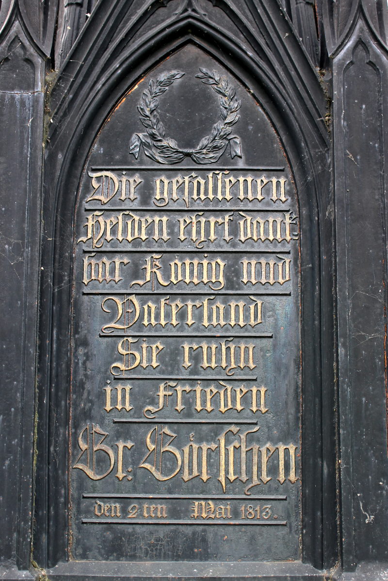 Das von Karl Friedrich Schinkel entworfene gusseiserne Denkmal für die Gefallenen der Schlacht ist eines von sieben gleichartigen an Schlachtenorten von 1813 und 1815. Die Inschrift lautet „Die gefallenen Helden ehrt dankbar König und Vaterland. Sie ruhen in Frieden. Großgörschen, den 2. Mai 1813“. Das verfallene Original stand auf dem Monarchenhügel…