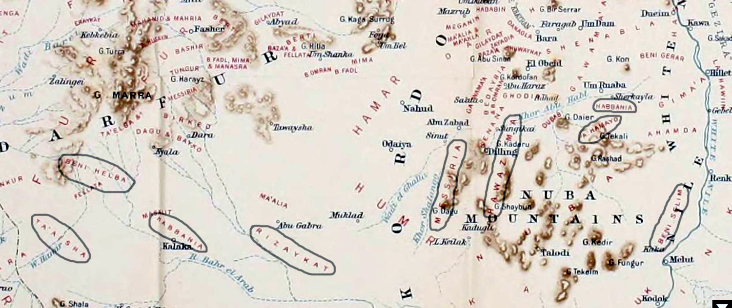 Man schätzt die Gesamtzahl der Einwohner Kordofans im Jahr 1880 auf 250.000 bis 300.000 Personen, wovon etwa 114.000 zu den Nomaden, also den Baggara und Abbala (Kamelnomaden) zählten. Count Gleichen führt in seinem „Handbook of the Sudan“ von 1898 die Anzahl der waffenfähigen Männer der verschiedene Stämme auf, gibt aber keinen Zeitpunkt für diese Schätzung an: Rizeigat 3.000 Krieger, Ta’aisha 7.500, Beni Halba 1.400, Habbaniya 3.500, Misseiria 200, Hawazma 50, Humr 2.500, Gima 1.000.