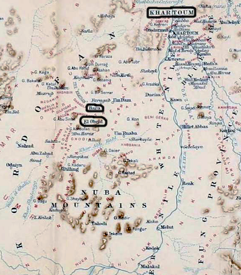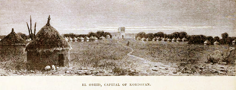 Nördlich der Nuba-Berge, rund 300 Kilometer westlich vom Weißen Nil entfernt, liegt die Hauptstadt Kordofans, El Obeid genannt. Der Name stammt von einer Senke, in der sich auch noch lange nach Regenfällen trinkbares Wasser sammelt. Nach einer alten Legende stürzte das Pferd eines Häuptlings in einen Regenteich, blieb im Schlamm stecken und ertrank. Die Einheimischen nannten den Ort deshalb „Fuhla chossahn el abiadt“, den Regenteich des weißen Pferdes und später einfach „el abiadt“, woraus schließlich El Obeid wurde. Die Stadt liegt inmitten der großen Ebene des nördlichen Kordofan und wird dort auf einer Höhe von 585 m im Südosten vom Berg Kordofan, im Norden vom Bergkegel Korbatsch und im Nordwesten vom kleinen Om-Heresa eingerahmt.