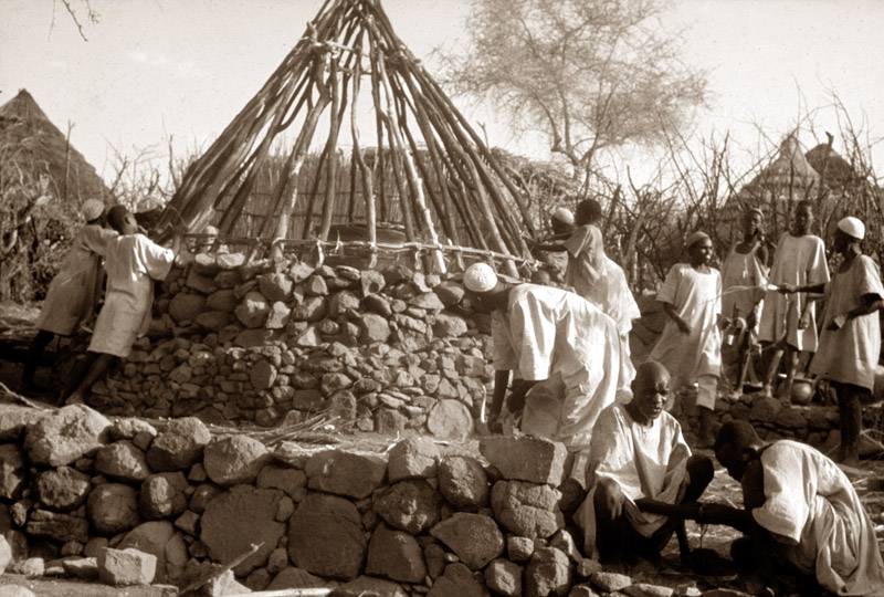Baggara errichten eine Tokhal aus Felssteinen. Hier ist gut die einfache Dachkonstruktion zu erkennen.