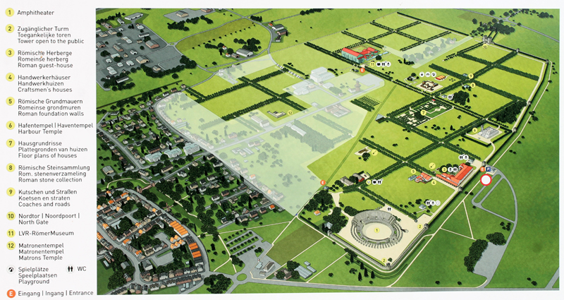 Jede idealtypische römische Stadt wurde von den beiden Hauptstraßen, dem Cardo Maximus und dem Decumanus Maximus in vier gleichgroße Viertel durchschnitten. Die ehemaligen Straßenverläufe sind im Park durch Baumalleen gekennzeichnet.