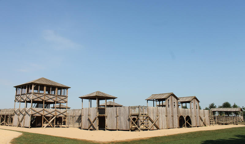 Der Kinderspielplatz der Anlage besteht aus einer riesigen Holzfestung und einem Wassergarten, in dem man römische Technik nacherleben kann.