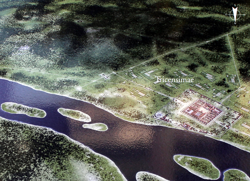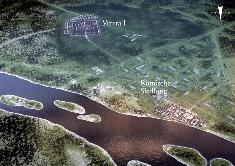 Um das Jahr 12 v. Chr. kamen erstmals römische Truppen in dieses Region. Sie errichteten das Militärlager VETERA auf dem nahe gelegenem Fürstenberg, denn dieser Ort hatte durch seine erhöhte Lage, die Nähe zum Rhein und als Zugang zur Lippe, auf der man tief nach Germanien vordringen konnte, ein wichtige strategische Bedeutung für das römische Reich. Außerdem lag Vetera an der Grenzstraße, dem Limesweg, der hier im Norden an lang des Rheins verlief. Im Jahre 9 v. Chr,, zu Zeiten des Augustus, war hier vermutlich der Sammelplatz für die 3 Legionen und Hilfstruppen des Varus, bevor diese zur verhängnisvollen Expedition bis nach Kalkriese aufbrachen, wo alle Legionen vernichtet wurden.