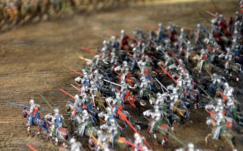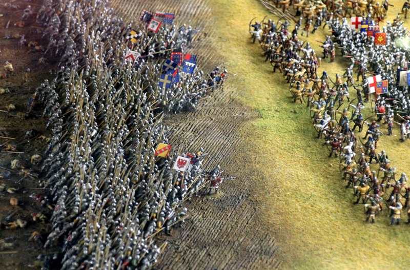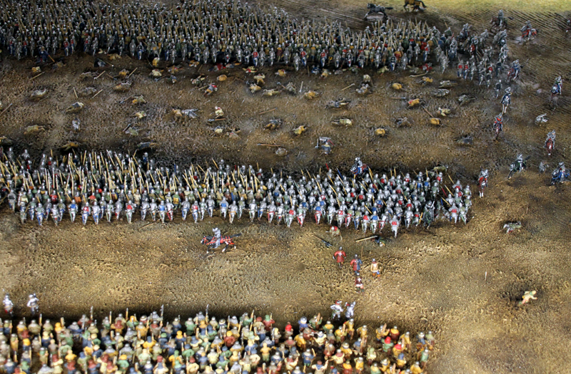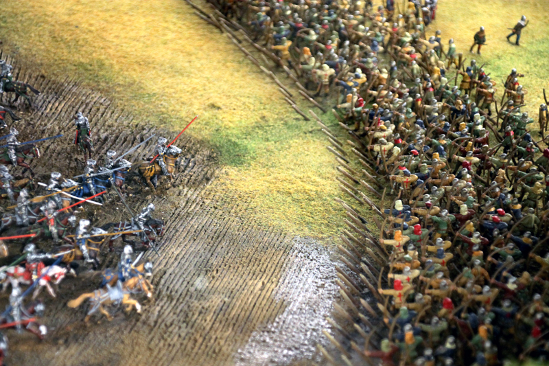 Das Diorama hält den Augenblick fest, in dem die englischen und französischen Armeen aufeinandertreffen. An den beiden Flanken haben die englischen Bogenschützen gerade den Angriff der französischen Kavallerie abgewehrt. Man sieht reiterlose Pferde und Ritter die zu Fuß zu den eigenen Linien zurückgehen. Unterdessen erreicht die Vorhut der französischen Ritter zu Fuß die englischen Linien. In der französischen Front sind Keile zu sehen, dort wo die Kommandeure und ihr Gefolge den Angriff anführen. In der Mitte der englischen Linie ist Henry V. und sein Gefolge zu sehen.