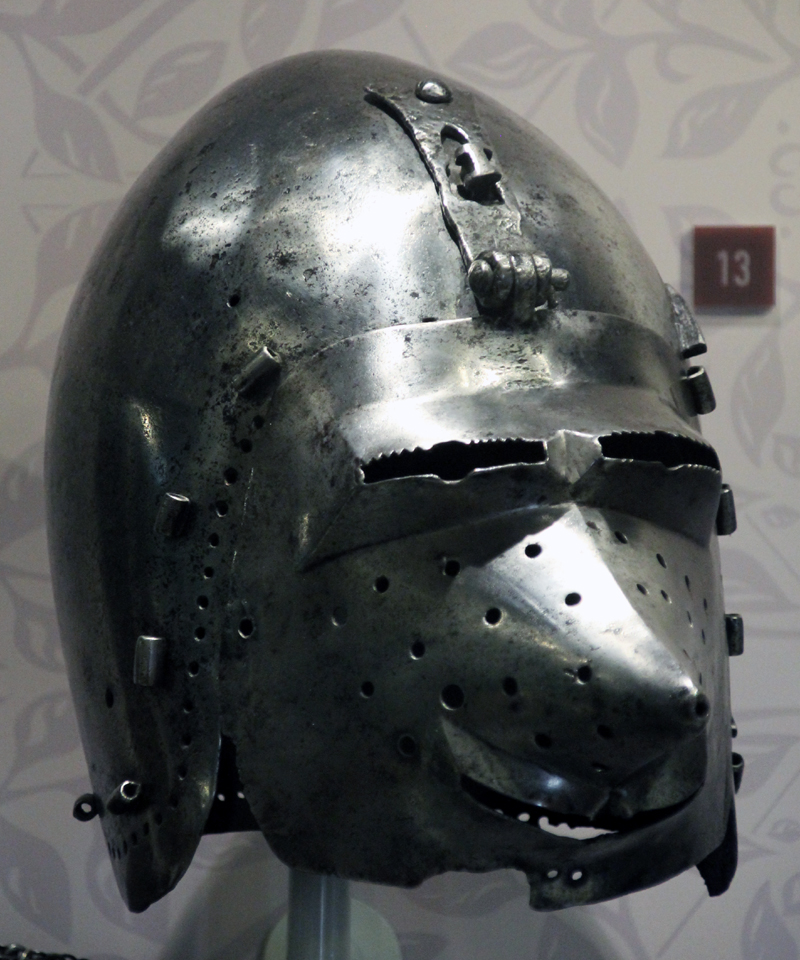 Im Gegensatz dazu steht dieser englische Topfhelm, einer von ganzen drei erhaltenen Exemplaren, der in den Anfängen des 100-jährigen Krieges getragen wurde.