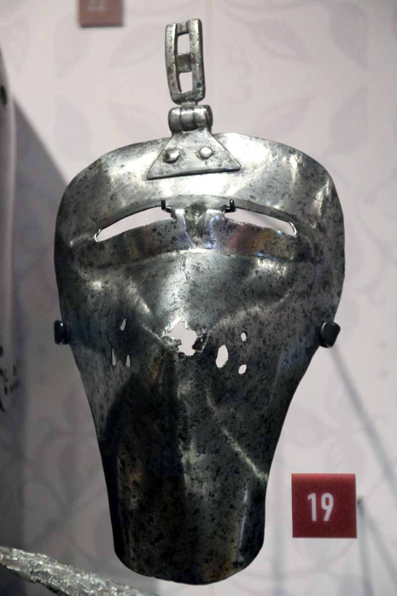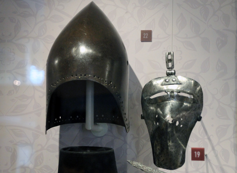 Zu sehen sind einige erlesene Helme, wie dieser Bacinet Helm aus dem Jahr 1390. Dieser Typ wurde ungefähr von 1380 bis 1420 hergestellt und sowohl von Engländern, als auch Franzosen in der Schlacht von Agincourt getragen.