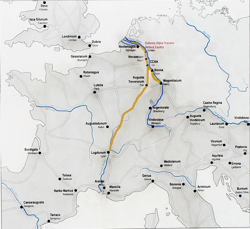 Von Britannien bis Nordafrika und von Portugal bis Syrien umfasste das römische Imperium eine riesige Landfläche von über 3,3 Millionen Quadratkilometern. Soldaten und Zivilisten, Kaufleute und Händler waren ständig im ganzen Reich unterwegs. Wo möglich, nutzte man die Wasserwege, denn auf dem Landweg ging es langsamer und mühseliger voran. Noch vor Christi Geburt verband eine große Süd-Nord Achse das Rheinland mit dem römischen Fernstraßennetz. Sie begann in Lyon, der Hauptstadt des römischen Gallien.