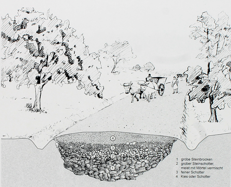 Am Niederrhein bestanden die Fahrbahnen nicht aus Steinplatten, sondern meist aus Kies und Sand.