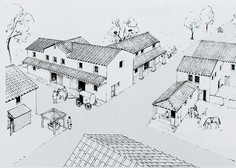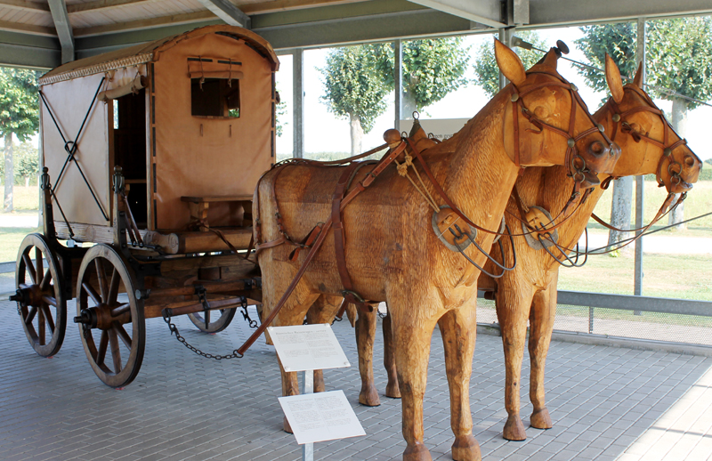 Ein Pavillon im Park bietet eine Fülle an Informationen über antike Fernstraßen, Kuriere, Straßenkarten – und drei fahrtüchtige Nachbauten von römischen Kutschen und Wagen, also alles zum Thema Mobilität der Antike.