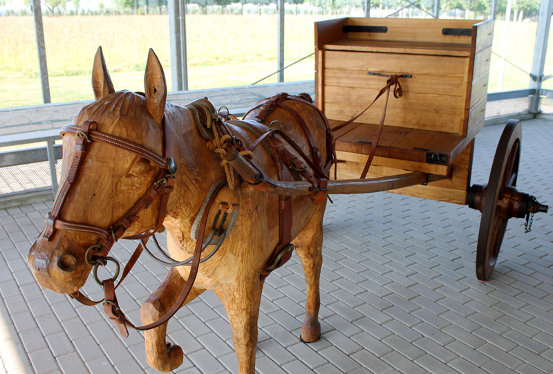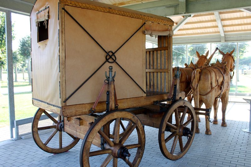 Mehr Komfort bot die Kutsche vom Typ der carruca. Ihr oberer Teil hing an starken Lederbändern, um Stöße auf unebener Strecke abzufedern. Die im Pavillon gezeigte Variante besaß eine Überdachung aus Leder und war für längere Reisen gebaut.