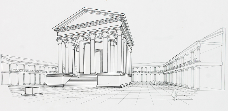 Eine breite Treppe führt auf das Podium und zur Cella, dem Kultraum des Tempels. Nur Priestern und Tempeldiener war einst der Zutritt in die Cella gestattet. Opferriten und andere Gottesdienste wurden aus diesem Grund am Altar vor dem Tempel abgehalten.