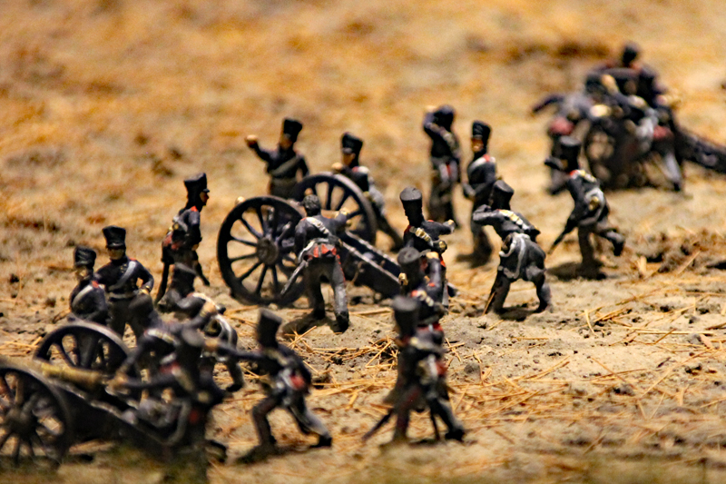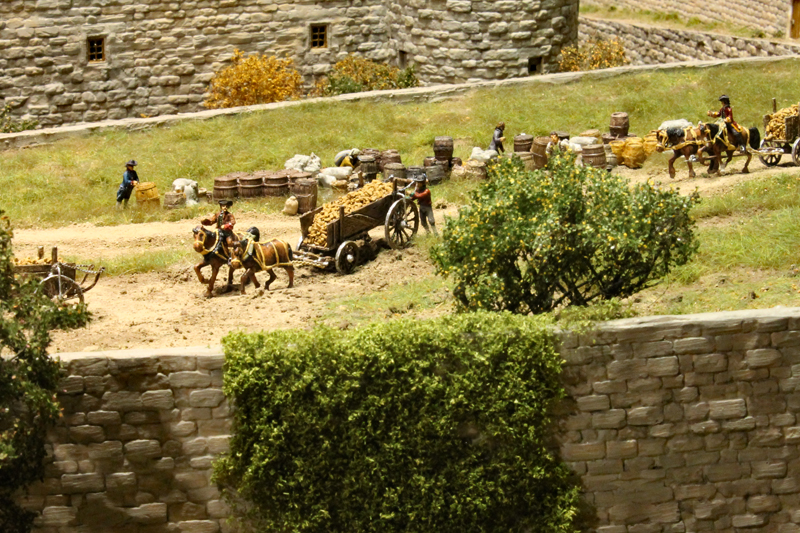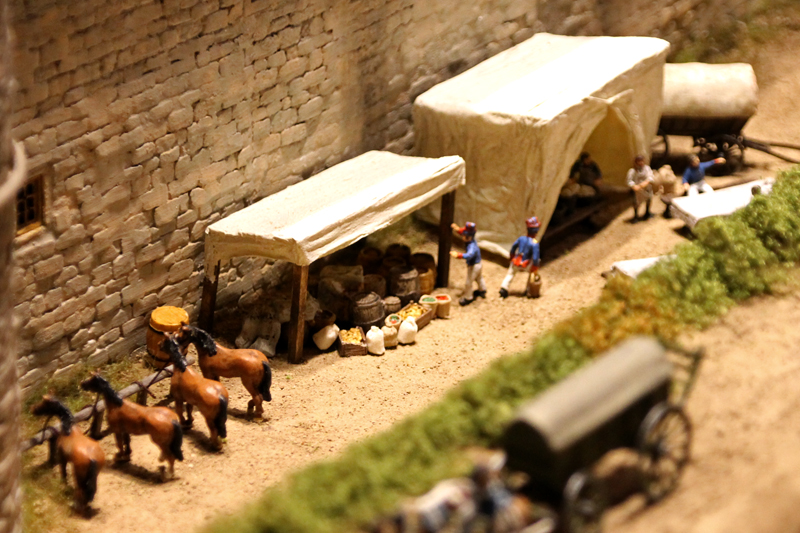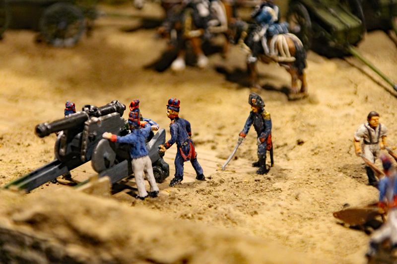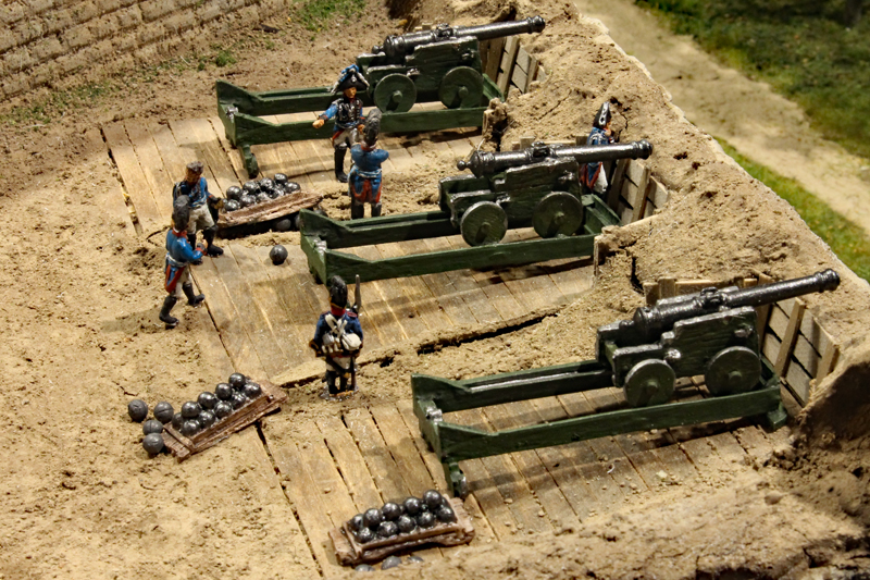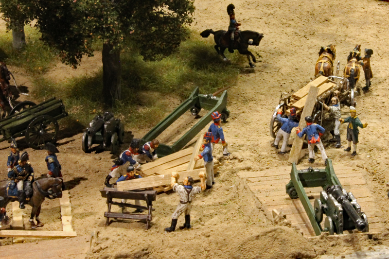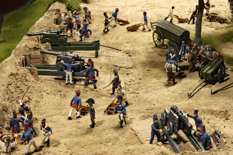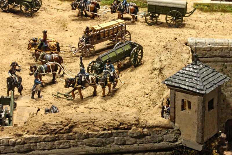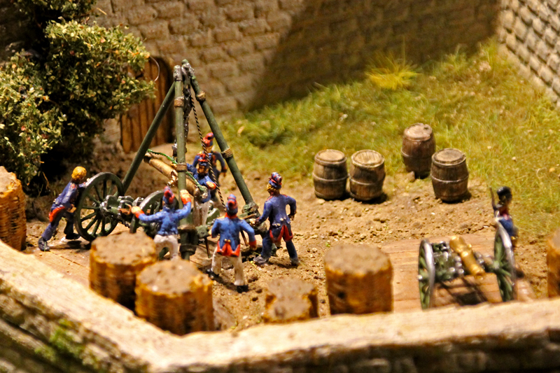 In vielen kleinen Szenen zeigt das Diorama, wie die Geschütze auf den Bastionen in Stellung gebracht wurden. Soweit ich es mitbekommen habe, ist nicht genau geklärt, welche und wie viele Geschütze verwendet wurden. Die gezeigten Modelle stelle also nur eine mögliche Variante dar.