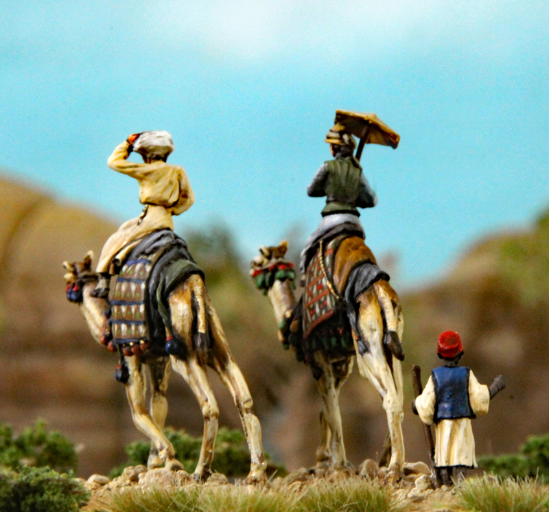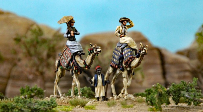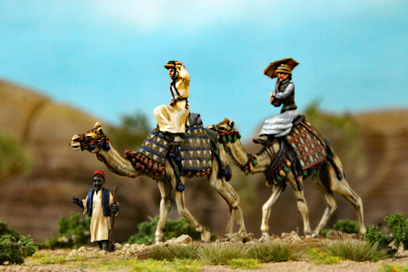 Der Figuren-Hersteller „Hinterland Miniaturen“ vertreibt unter dem Namen „Camel Train“ ein sehr schönes Figuren-Set von 2 europäische Damen auf einem Kamel, die von einem einheimischen Jungen geführt werden. Diese Szene ist mit Sicherheit dem Ausritt von Ernestine Sartorius und ihrer Stiefschwester nachempfunden und darf somit natürlich nicht in meiner Figurensammlung fehlen.