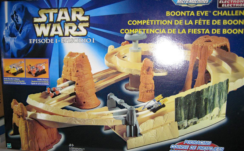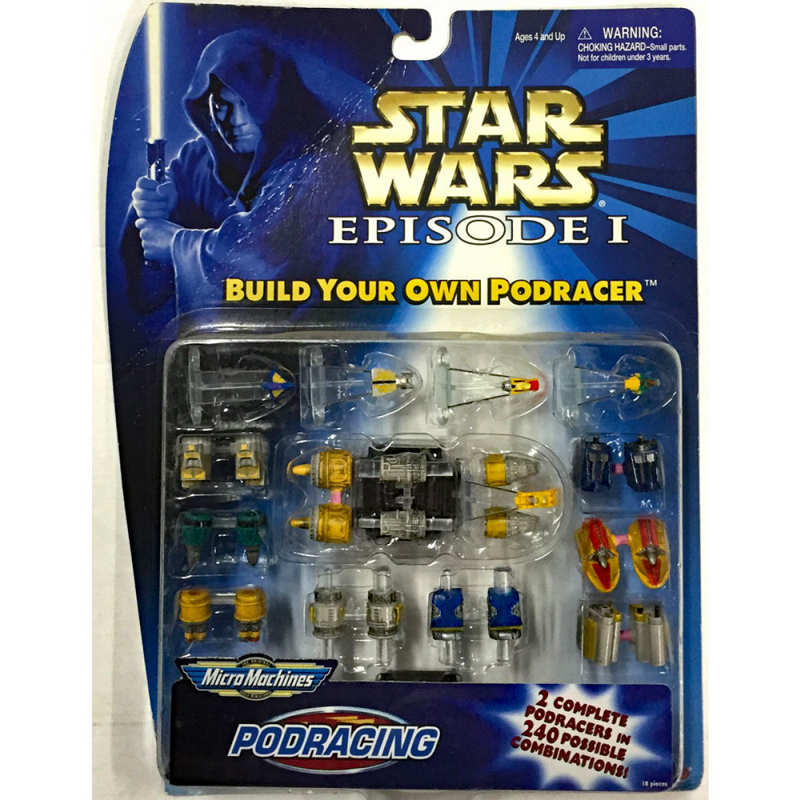 Ich bin nicht mal ganz sicher wie viele unterschiedliche Modelle von Mirco Machines erschienen sind. Es gibt zunächst 4 Packs mit je zwei Fahrzeugen, je zwei weitere Podracer (teilweise mit den Einzelsets identisch) kommen mit den Set der Rennstrecke, der Boonta Eve Challenge, den Ausbausets Podracer Launchers, Beggar Canyon Challenge und Arch Canyon Challenge sowie einem Rennfahrzeug mit der Podracer Arena. Mit dem Sets BUILD-YOUR-OWN Podracer, das auch noch in verschiedenen Farben erhältlich ist, bieten sich weitere zahllose Möglichkeiten Varianten zu kreieren. Außerdem gibt es in der Mirco Machines Serie „Episode I“ ebenfalls einzelne Podracer zu ergattern. Insgesamt kommt man so auf 25 bis 30 unterschiedliche Fahrzeuge, die man erwerben kann.