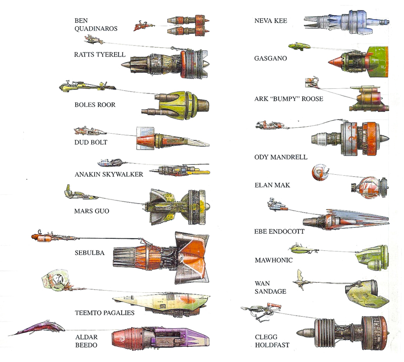 Interessant sind natürlich auch die Geschichten und vor allem die sehr abenteuerliche Optik der Podrenner Piloten im Film. Kurz genannt seien hier Clegg Holdfast, der Nosaurianer vom Planeten Neu-Plympto, der Vulptereen Dud Bolt mit einem Podracer 327-Modell und natürlich der legendäre Ben Quadinaros, der sein Fahrzeug gleich beim Start abwürgte. In der neuen Blue-Ray Fassung des Films werden ja auch fast alle Rennfahrer kurz vorgestellt. Diese Szene muss man natürlich vor jedem Rennen noch mal schnell schauen.