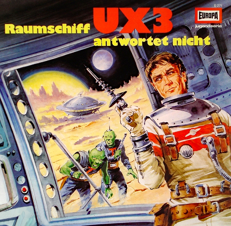 Nach dem sensationellen Erfolg von Commander Perkins legte die Firma Europa mit einigen weiteren SF-Hörspielen nach. Eine dieser Geschichte hieß „Raumschiff UX-3 antwortet nicht“. Der Stil dieser kleinen Episode war völlig anders. Es ging um eine Art aggressive Raumschiffcrew a la Raumschiff Enterprise, die nicht die Erforschung, sondern die Eroberung des Universums zur Aufgabe hatte. Zudem war die irdische Raumflotte mit weit überlegender Technik ausgestattet. Die Sprecher des Hörspiels, wie Hans Clarin, Hosrt Stark und Hellmut Lange machen einen tollen Job und tragen zum locker-lässigen Ton der Raumschiffbesatzung bei. Commander Tex Terry kommandiert den schnellen Raumkreuzer UM-9. Er und seine Crew, Co-Pilot Björn, Astrogator Senic, Telepath Tuang-Yi und die Technikerin Cora erhalten den Auftrag, einem Notruf des Kreuzers UX-3 nachzugehen. Dieser scheint mit den Uläern in Konflikt geraten zu sein. Über die Texte kann man sich köstlich amüsieren…