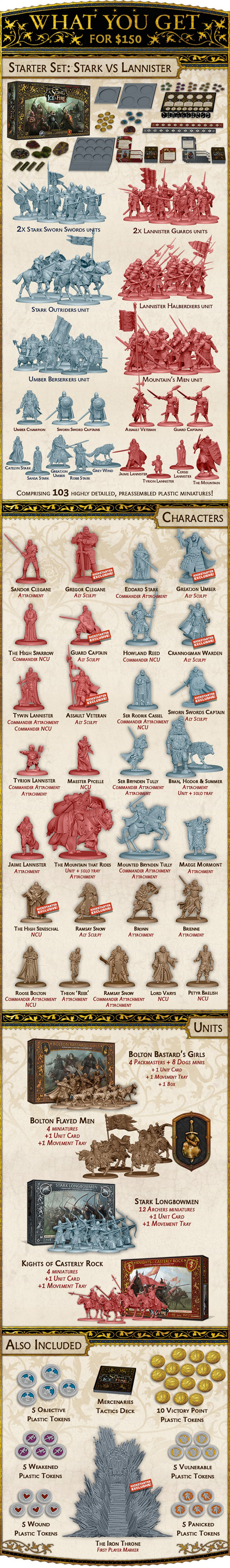 Startpunkt für die Geschichte vom „A Song of Ice and Fire“ – TableTop ist der Tod von Robert Baratheon und der Beginn des Krieges der fünf Könige. Aus diesem Grund beinhaltet das erste Starter-Set Truppen und Charaktere der Häuser Lennister und Stark. Durch die Kickstarter-Strechgoals und durch zusätzliche Einheiten und Figuren, die man im Rahmen des Kickstarters erwerben konnte, startet das Spiel mit eine erstaunlich großen Anzahl von Einheiten und Charakteren.