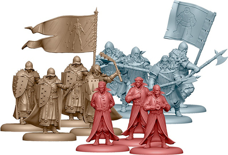 Die Rechte zur Produktion von Figuren, die auf Charakteren der Romane beruhen, liegen schon seit etlichen Jahren bei Dark Sword Miniatures. Aus diesem Grund handelt es sich bei dem neuen TableTop Spiel auch um eine Kooperation zwischen CMON und Dark Sword. Dies ist wohl auch der Grund, warum die Figuren in der Größe von 32mm auf den Markt gebracht werden, denn dabei handelt es sich um den Maßstab, den Dark Sword für seine Figurenreihe verwendet. Sicher erhofft sich der Hersteller, dass so einige zusätzliche Verkäufe seiner Zinnfiguren zustanden kommen. Durch den Kontakt von Dark Sword Miniatures zu George R.R. Martin wird das Figuren-Design außerdem durch den Schriftsteller überwacht. George R.R. Martin ist selbst ein begeisterter Figurensammler und Dioramenbauer. Hier eine kurzer Bericht, den er über seine Leidenschaft verfasst hat: