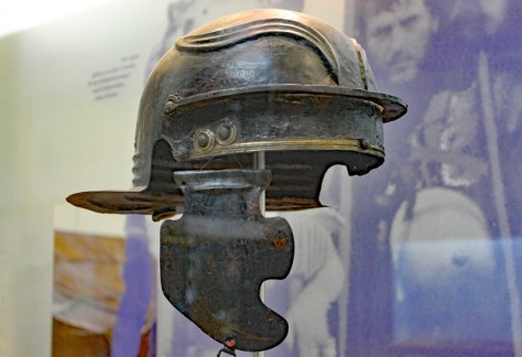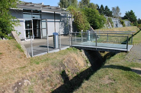 Zunächst muss man einige Worte zur Gestaltung des Museums verlieren. Der Museumsbau mit seinen gläsernen „Zeltspitzen“ auf dem Dach, ist einem römischen Zeltlager nachempfunden. Vor der Front des Gebäudes ist außerdem ein rekonstruierter Erdwall mit dem davorliegenden Spitzgraben zu sehen, wie er vermutlich an dieser Stelle auch dem damaligen römischen Lager als Sicherung diente. Über eine Art „Zugbrücke“ gelangt man schließlich zum eigentlichen Eingang des Museums.